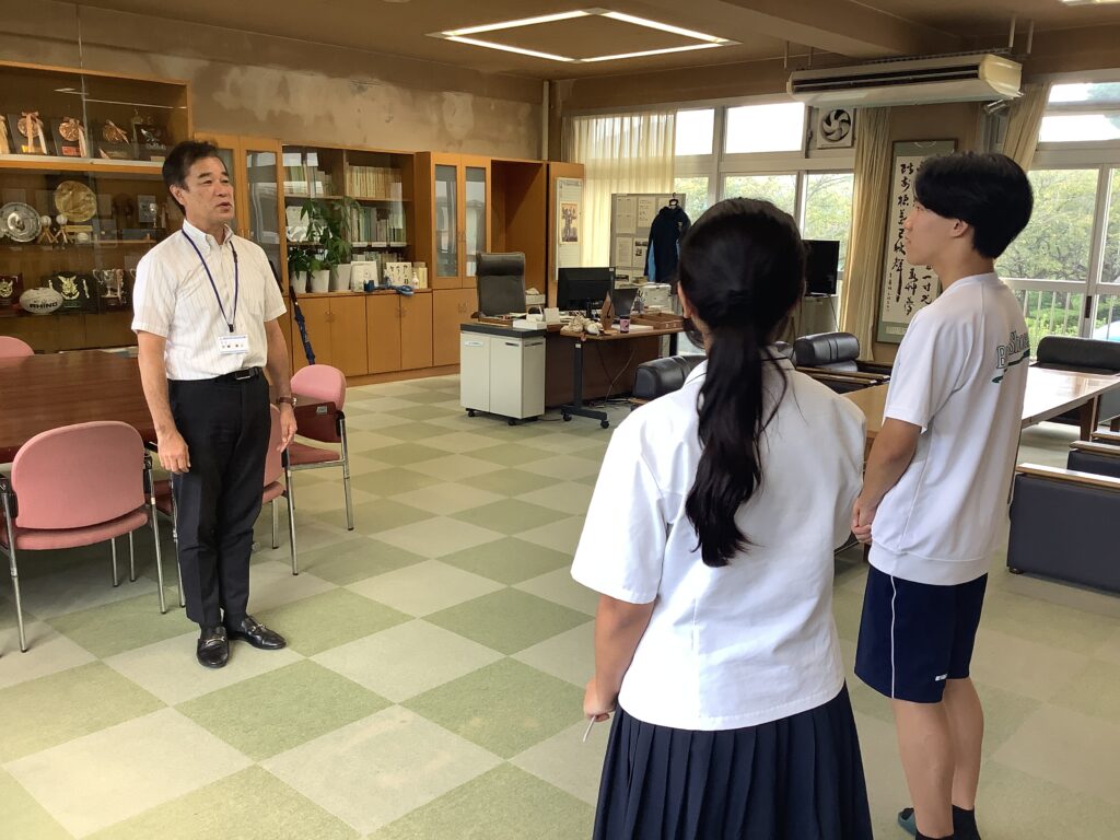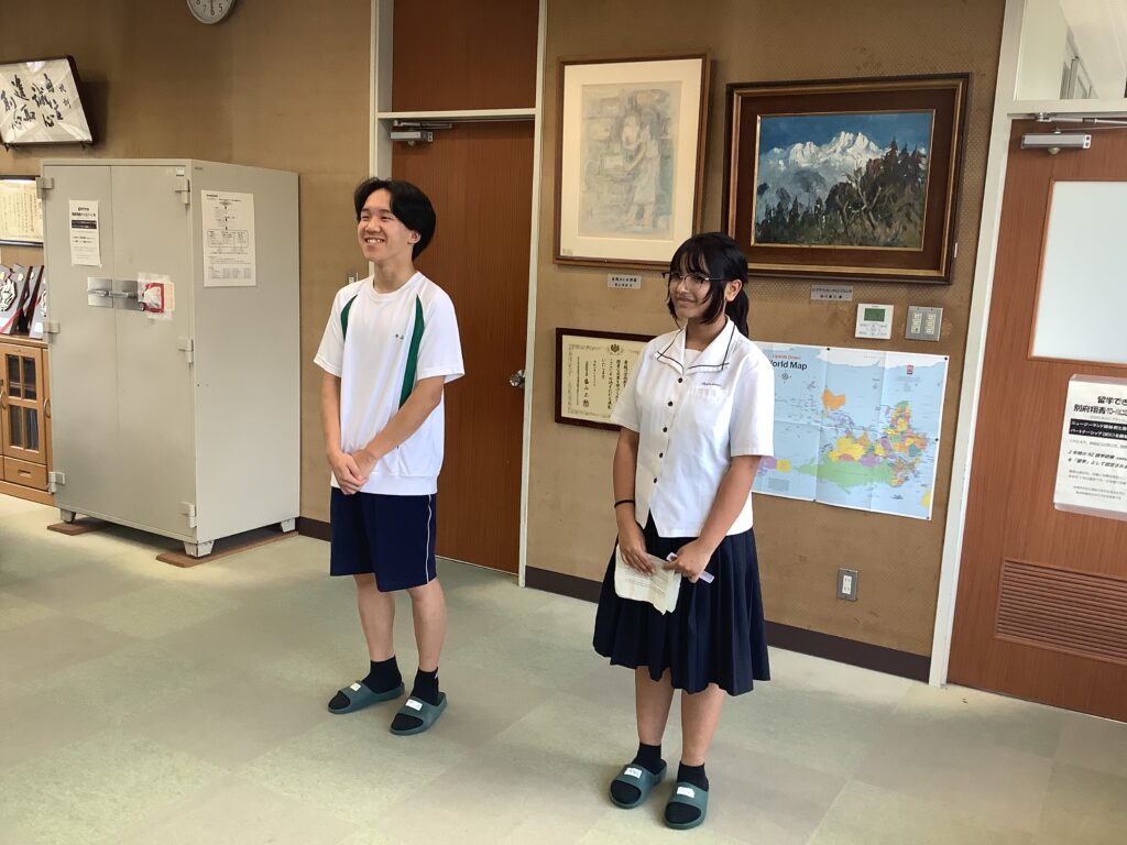 21日(日)に行われる大分県高等学校英語弁論大会に本校代表として出場するGC科の アリアル・アチャルさん と 平山陽向さん が、挨拶に来てくれました。