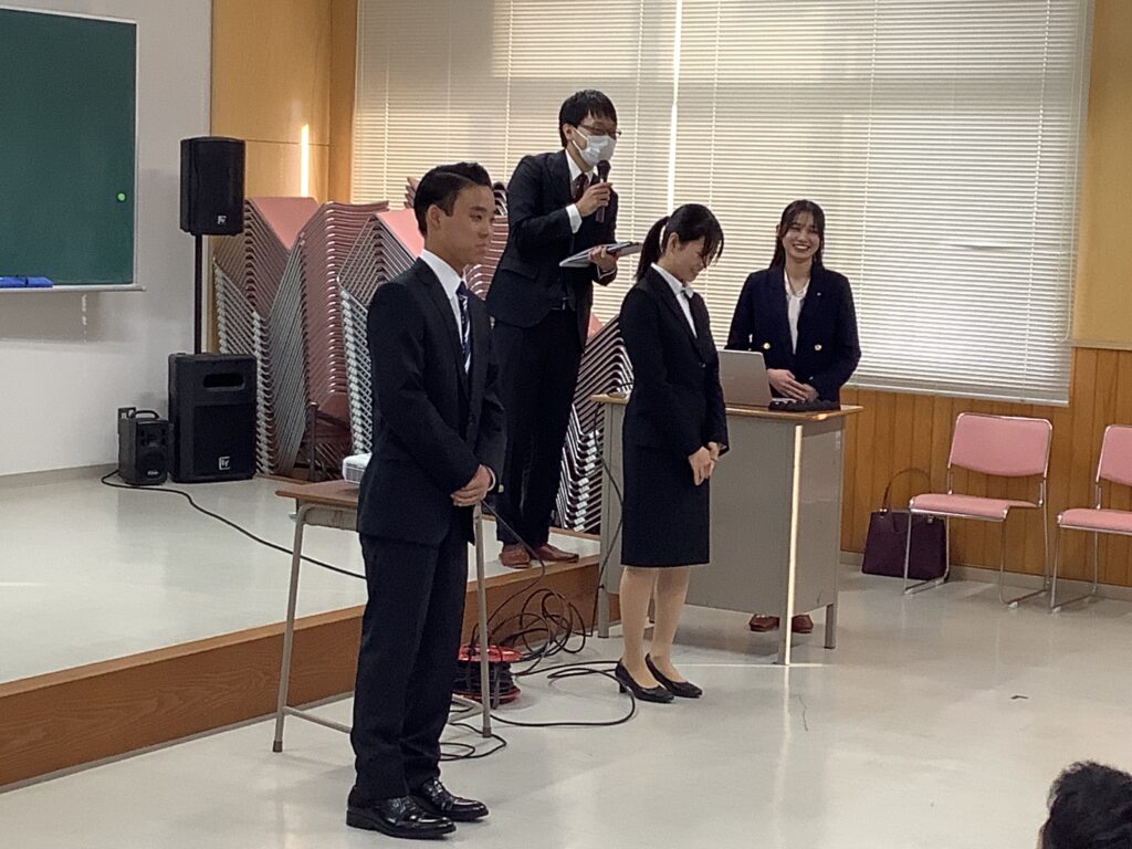 フタタ鶴崎森町店 店長 江島 宏貴 様/スーツセレクト 副主任 土屋 みゆき 様をお招きし、3学年第1回巣立ち講座「スーツ着こなしセミナー」を実施しました。