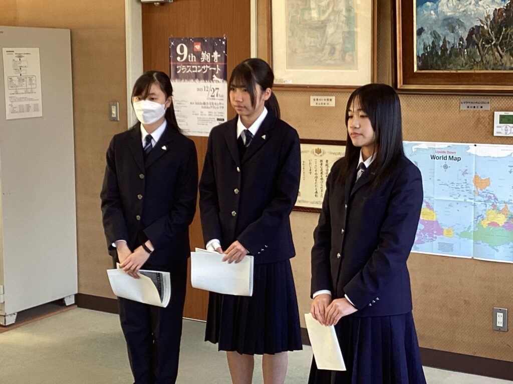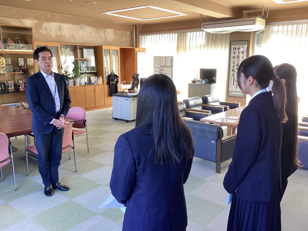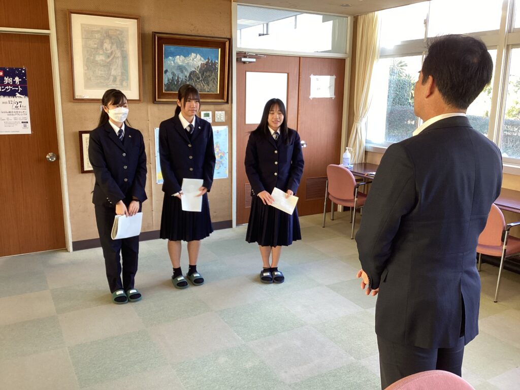 第16回「いっしょに読もう!新聞コンクール」において、大分県NIE推進協議会賞を受賞した手島夏美さん、相馬さくらさん、後藤はなゆみさんの3名が、受賞の報告に来てくれました。