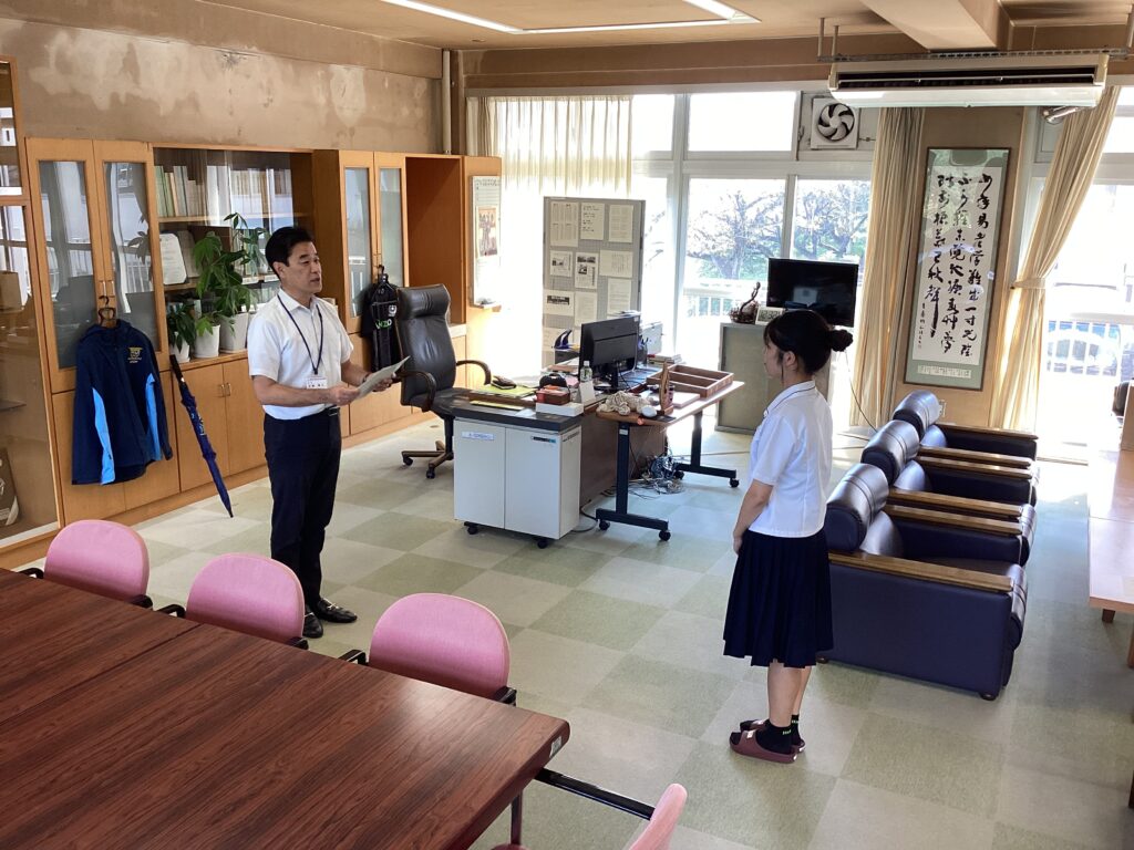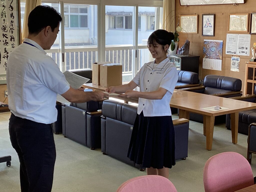 「学校への要望」の回答書を、生徒会長に手渡しました。回答が遅くなったことをお詫びいたします。