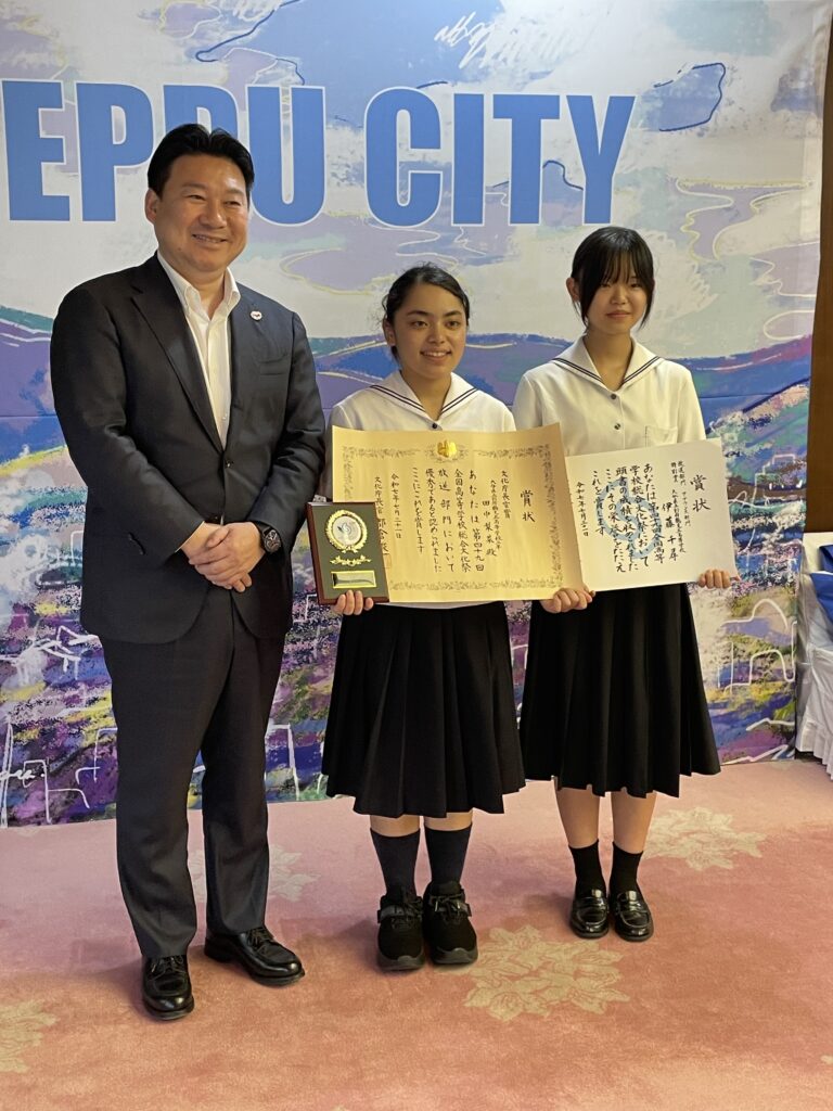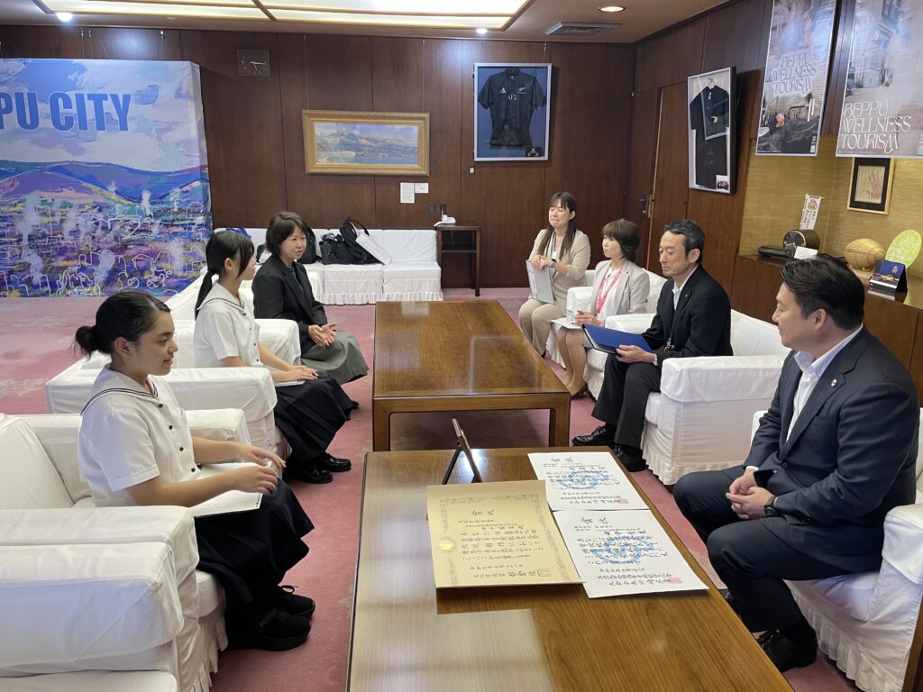 鶴高ホームページをご覧の皆様、こんにちは。HP作成担当『中の人』です。「暑さ寒さも彼岸まで」と昔から言われていますので、早く涼しくなってくれと日々願っている『中の人』でありますが、部活動の生徒たちは暑かろうが、寒かろうが、自分たちの掲げた目標達成に向けて、日々研鑽を積んでいます。今回はそんな部活動に励んでいる生徒たちの中から、この夏の全国大会で活躍した生徒たちの別府市長表敬訪問について報告します。
