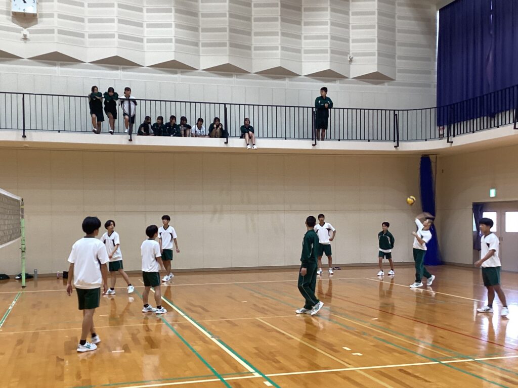 11月12日(水)本校体育館と多目的体育館において、1年生のクラスマッチを実施しました。まずクラス全員で長縄跳びを行い、その後男子も女子もバレーボールかバスケットボールのどちらかを選んで出場しました。始まる前からどのクラスも気合が入っていましたが、いざクラスマッチが始まるとクラスで協力している姿やクラスの仲間に声援を送っている様子が微笑ましく感じられました。そして、白熱したクラスマッチの後は、男女混成の生徒選抜チームと1年部の先生たちのドリームチーム(?)によるバレーボールのエキシビジョンマッチを行いました。先生たちの躍動する姿(?)や日頃は見ることのない姿に、この日一番の歓声が体育館に響き渡りました。