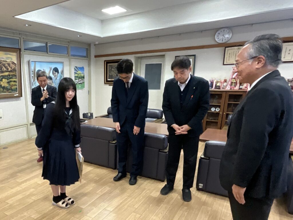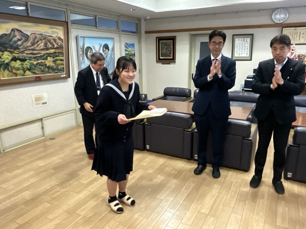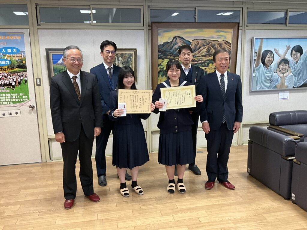 12月1日(月)、見事入選を果たした彼女たちに賞状を授与するため、別府税務署長の谷口 孝秀様、別府市教育委員会教育長の寺岡 悌二様をはじめ5名の方々が来校されました。表彰式は校長室で行われ、徳丸さんも濱田さんも若干緊張しながらも晴れやかな表情で賞状を受け取っていました。