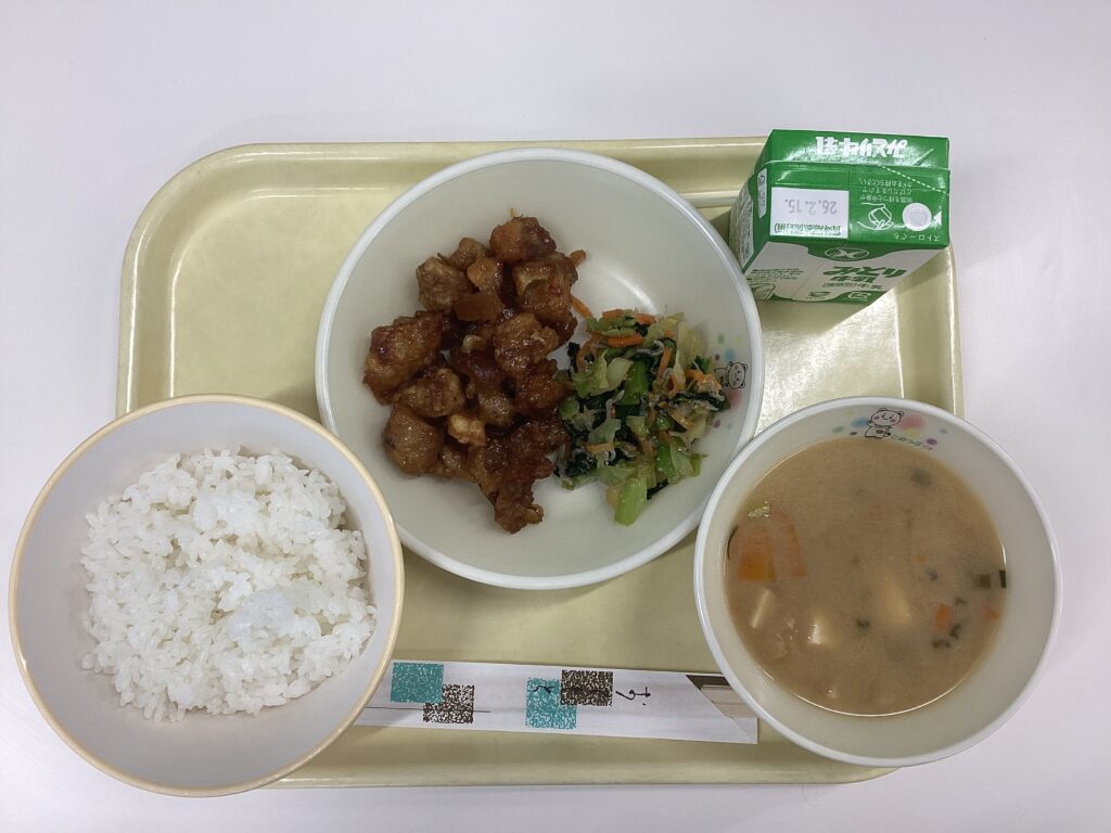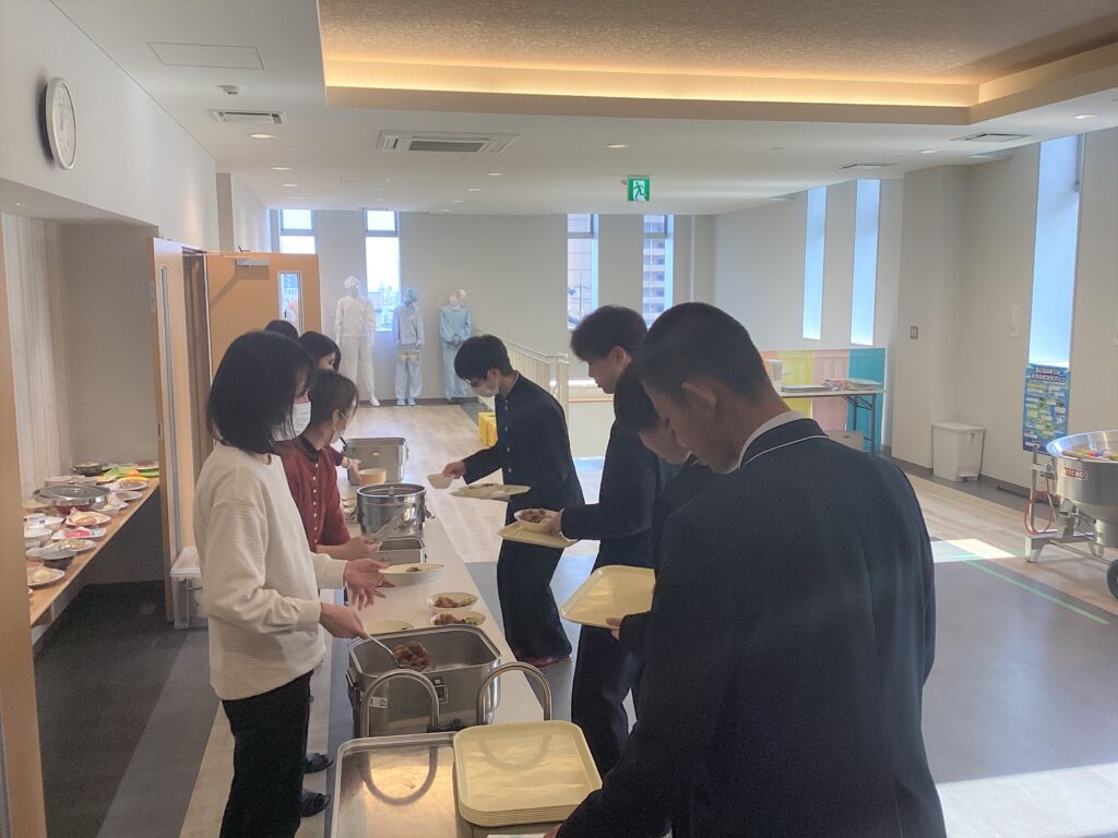 2学期に「総合的な探究の時間(湯の町探究)」の一環として、1年生「製造」1班が自分たちで考案したメニューを別府市給食センターに提案しました。メニュー名は「揚げ鶏のざぼん漬けードソース」。ザボン漬けをマーマレードになぞらえて命名したのですが、このたびそのメニューが現実化されて、実際に別府市の給食メニューとなりました。さらに、2月8日(金)給食センターの方々のご厚意により、自分たちが考案した給食を試食する機会をいただきました。