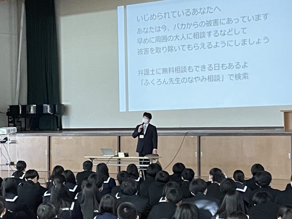 3月3日(火)7限、体育館にて1・2年生全員を対象とした「いじめ予防授業」を実施いたしました。講師には、本校(別府鶴見丘高校)の卒業生でもある、城崎法律事務所の田中良太弁護士をお招きしました。先輩という親しみやすい立場から、後輩たちへ向けて熱いメッセージを届けていただきました。
