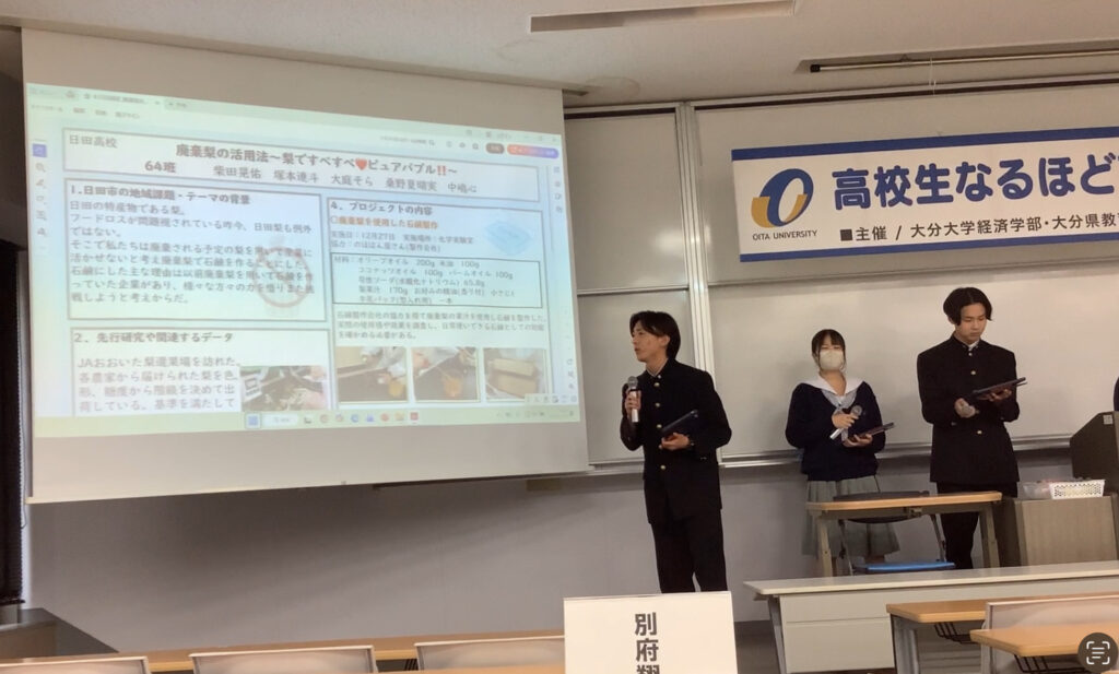 本校3年生水郷ひた学より「36班:#アプリ作ってみた」と「64班:廃棄梨の活用法〜梨ですべすべピュアバブル」の2班が最終選考まで進み、プレゼンを行いました。