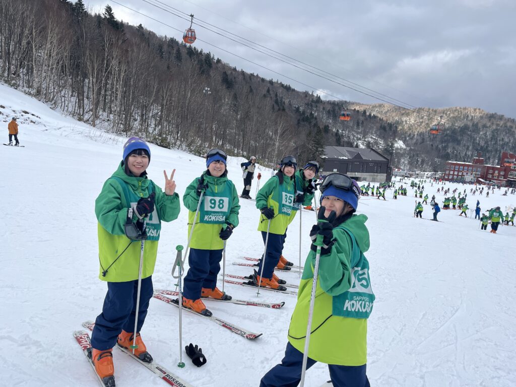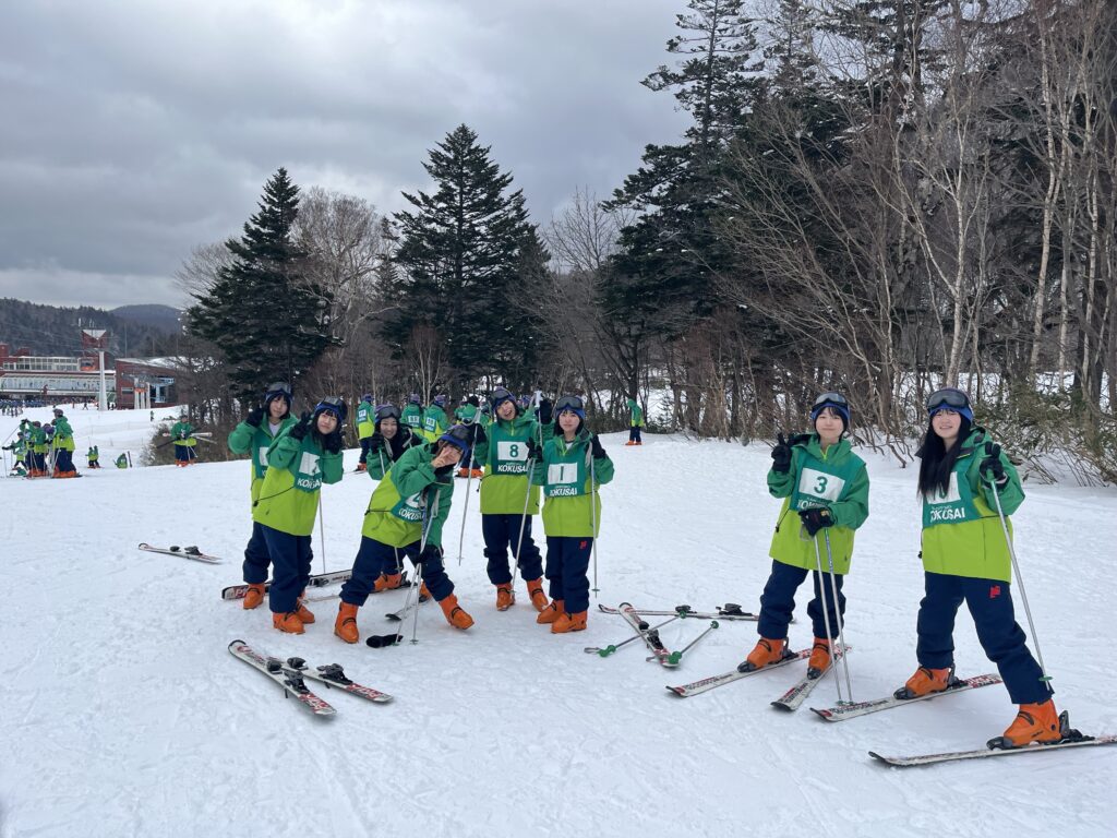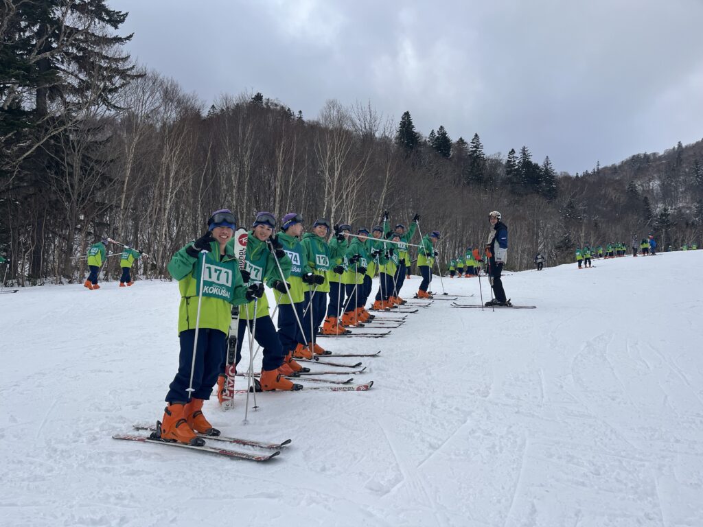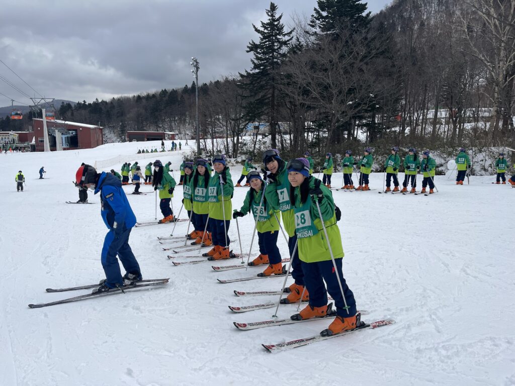 修学旅行2日目はスキー研修です。みんな緑のスキーウェアに身を包み、白銀のゲレンデに降り立ちました。今日は日曜日とあって、一般のお客さんも多かったです。スキー靴を履いて歩く姿はペンギン!