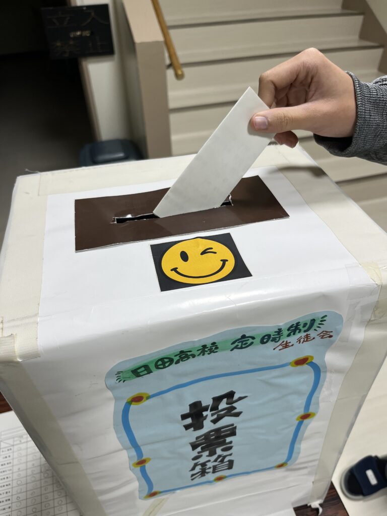 信任を呼びかける候補者のみなさん これまで全校を引っ張ってくれた会長・副会長 投票箱