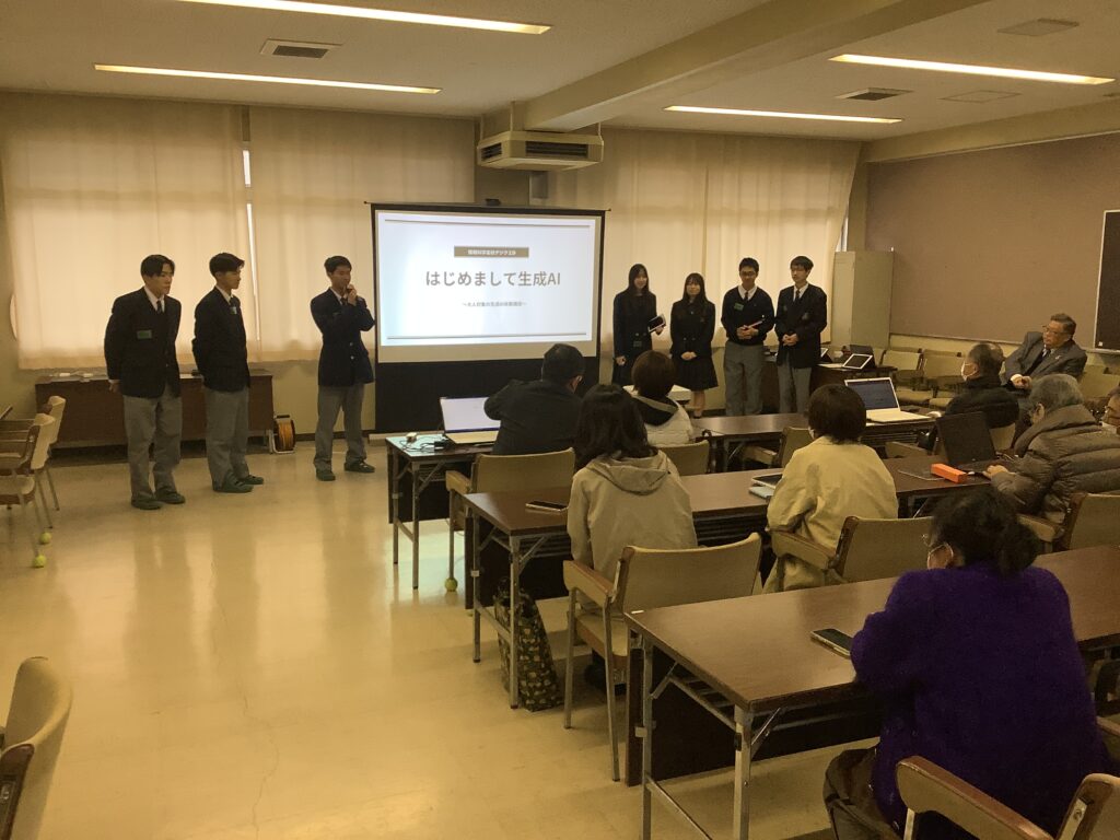 デジクエDグループ(デジタル創造科3年生と2年生の有志)は、12月13日(土)に大人を対象とした生成AI体験講座「はじめまして、生成AI」を実施しました。本講座を企画するにあたり、生成AIにあまり詳しくない方を想定したペルソナを作成し、そのような参加者に生成AIをどのように分かりやすく伝えるかを考え、講座の計画を立てました。講座の前半では、高校生が講師となり、生成AIの仕組みや活用方法について説明しました。また、利用する際の注意点として、ハルシネーションやディープフェイクなどの危険性についても解説しました。後半では、前半で学んだ知識を生かし、参加者の皆さんと一緒に最新のさまざまな生成AIを実際に体験していただきました。画像生成AIでは、特定の名称を使わずにキャラクターの特徴を言葉で表現するプロンプト作成に挑戦しました。また、対話型AI(ChatGPT)を活用し、宿泊日数や予算などの条件を入力して旅行計画を作成する体験活動も行いました。最後の活動では、参加者が「生成AIでやってみたいこと」を高校生と相談しながら、音楽制作や写真1枚から映像を生成する体験を行いました。生成AIを使ってお孫さんの写真を動かし、会話をさせる体験をされる参加者もおり、生成AIの新たな可能性を感じる場面となりました。本校では今後も、生成AIに関する正しい知識と活用方法について、積極的に情報発信を行っていきます!