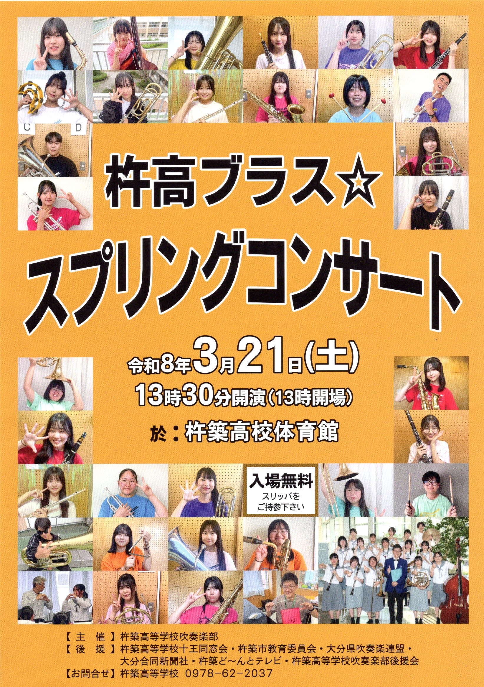 本校吹奏楽部の定期演奏会「杵高ブラス★スプリングコンサート」が、今年も本校体育館にて3月21日(土)の午後、開催されます。