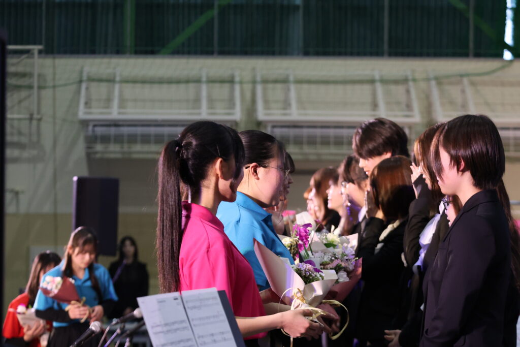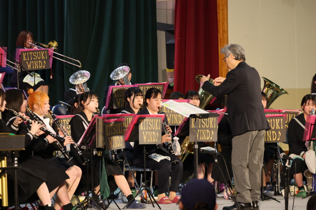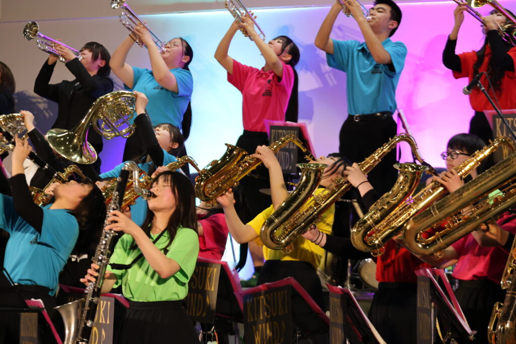 第1部では制服での粛々とした演奏、第2部ではポロシャツで歌やダンスを交えた華やかな演奏を披露しました。一音一音を丁寧に奏で、心を届けたいという思いが重なり合った演奏は、今年のテーマ「紡(つむぐ)」を体現するものでした。