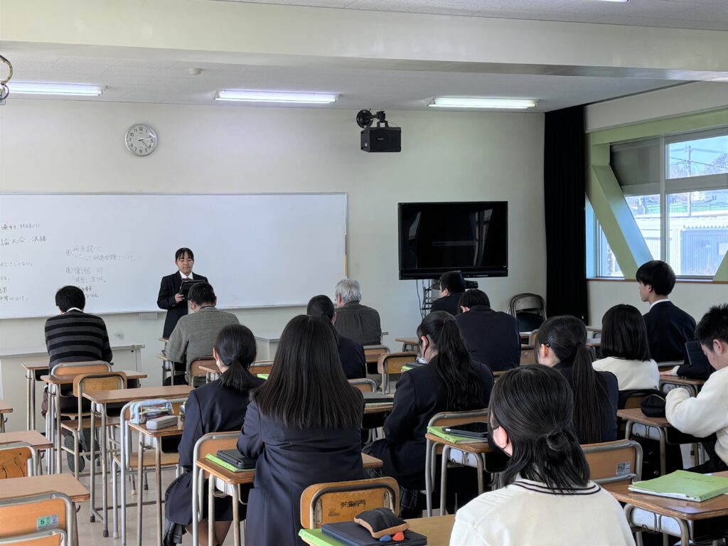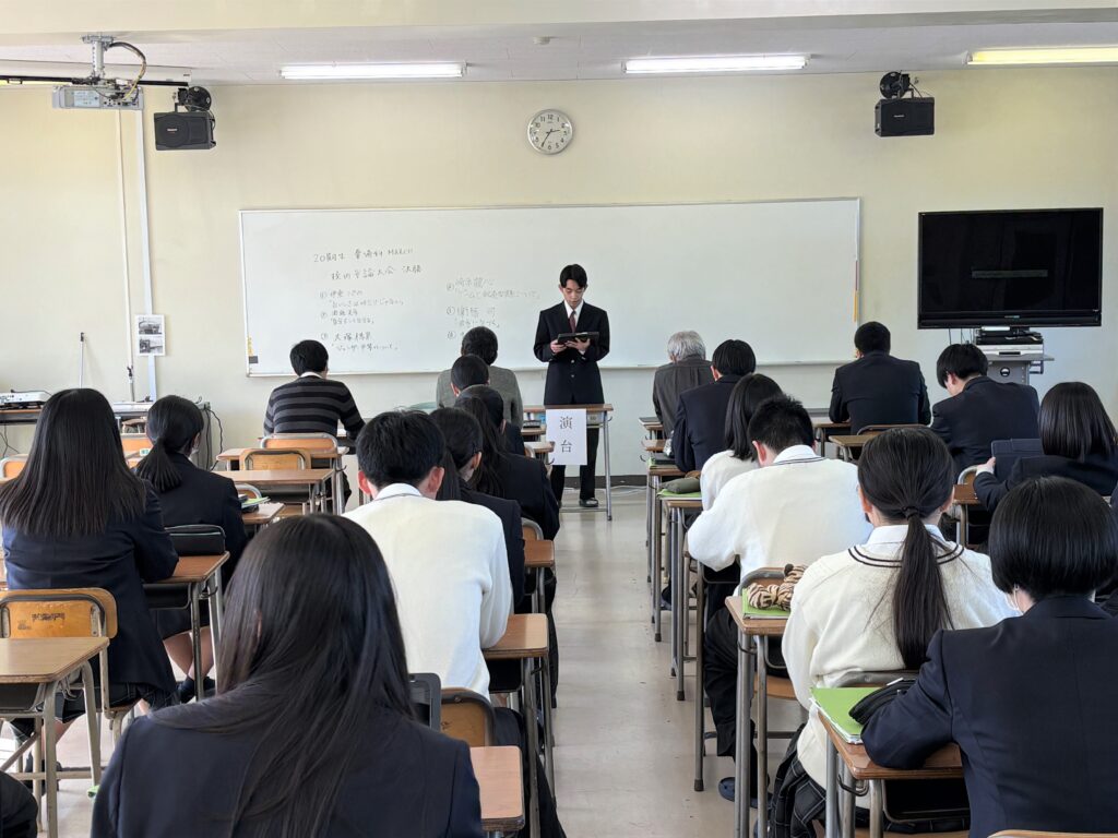1/19に予選を勝ち抜いた6名の決勝進出者による、弁論が1/26(月)MARCHの時間に行われました。演題は、「おいしさは味だけじゃない」「自分らしく生きる」「ジェンダー平等について」「ゲームと転売問題について」「健康に気づく」「傷のない社会」で、それぞれ自分の考えや普段感じている様々な社会問題について、自分の意見を述べていました。