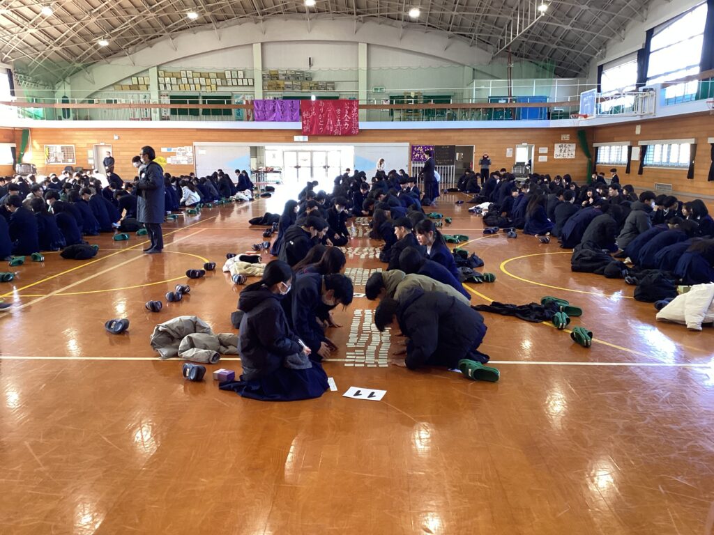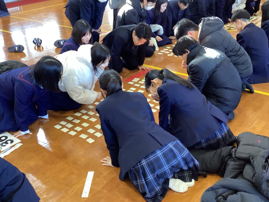 新春の恒例行事「小倉百人一首大会」が、1月9日(金)の5・6限に体育館で行われました。対象は1・2年生で、クラス対抗戦として実施。会場には緊張感と熱気が入り混じり、札が読まれるたびに真剣なまなざしが光っていました。