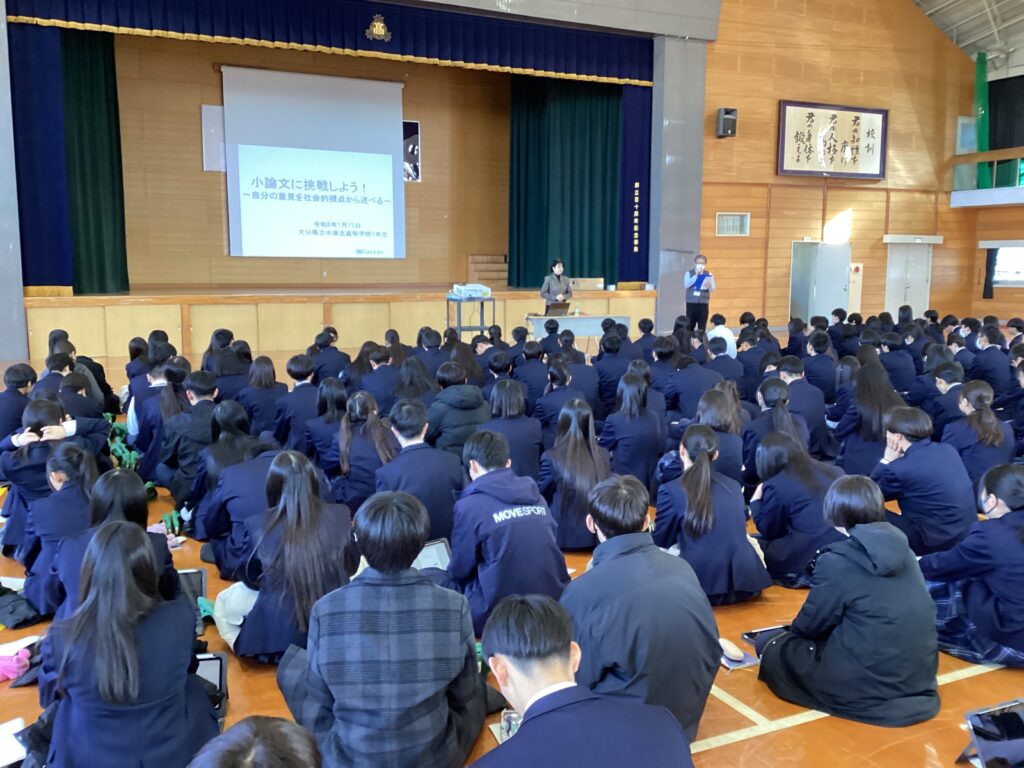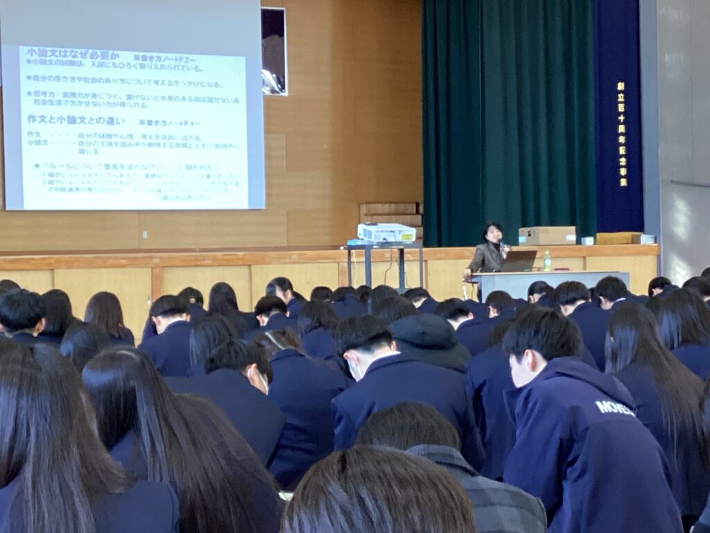 1月15日(木)6限、1年生を対象に小論文講座を実施しました。講座ではまず、作文と小論文の違いについて確認し、小論文は社会的なテーマに対して、自分の意見を根拠とともに論理的に述べる文章であることを学びました。生徒から「今まで作文と同じだと思っていた」、「考え方を整理することが大切だと分かった」等の感想が聞かれました。続いて、小論文の3つの種類や基本的な構成、書く際のテクニックについての説明を受けました。実際に小論文を書く活動では、「最初は難しかったが、書き方が分かってきた」「自分の意見を文章にするのが少し楽しくなった」という前向きな反応も見られました。本講座を通して、考える力と表現する力を伸ばす第一歩となる貴重な時間となりました。