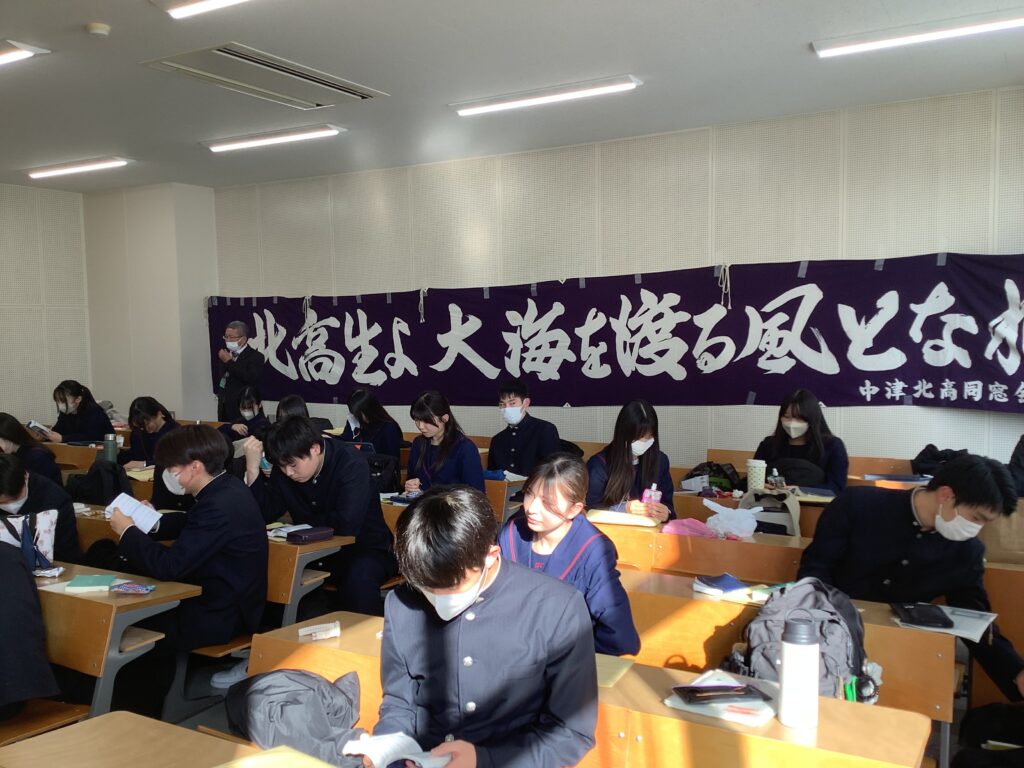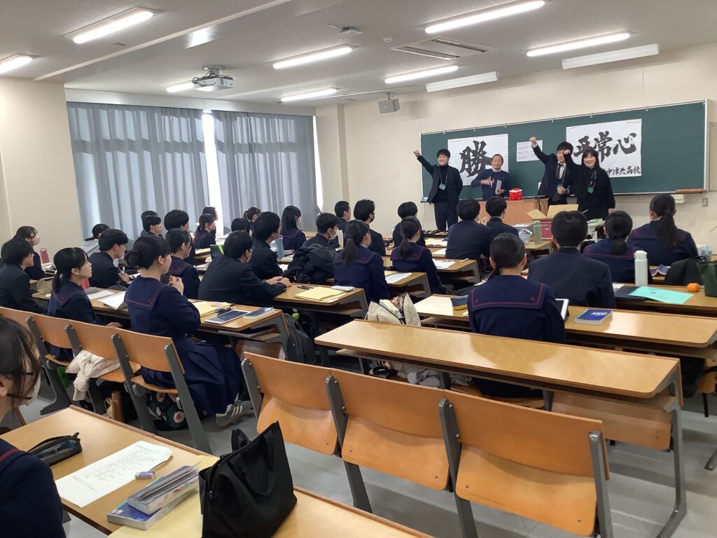 1月17日(土)・18日(日) 「令和8年度大学入学共通テスト」を受験しました。今年は、別府大学が会場で、落ち着いた環境の中で生徒たちは「勝」と「平常心」を心に刻み、全力で試験に臨みました。また、試験前には各教科担当の先生方から熱いエールが送られ、生徒たちのモチベーションアップに繋がりました。