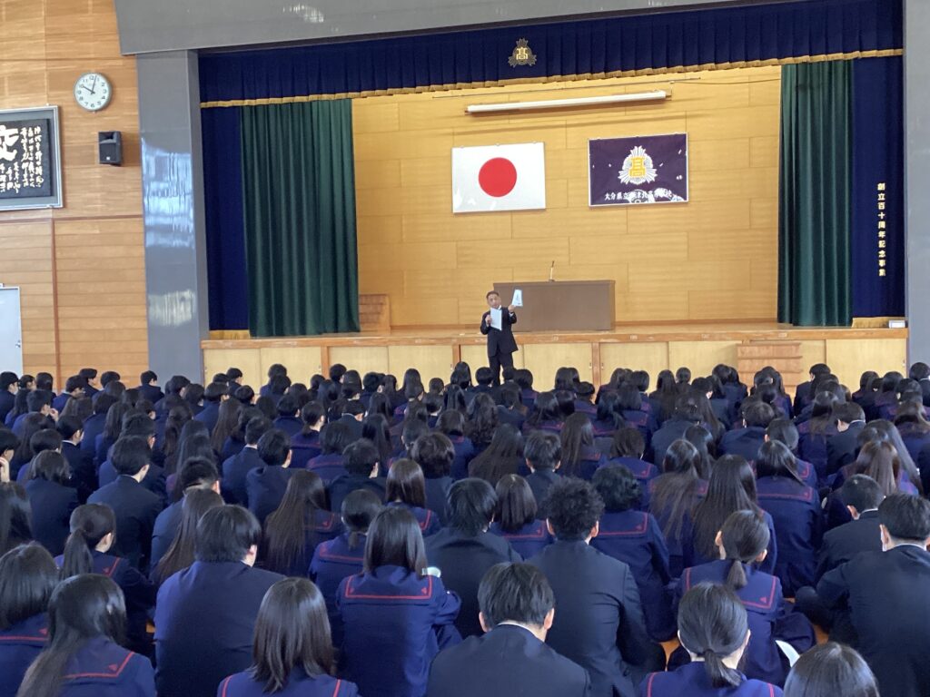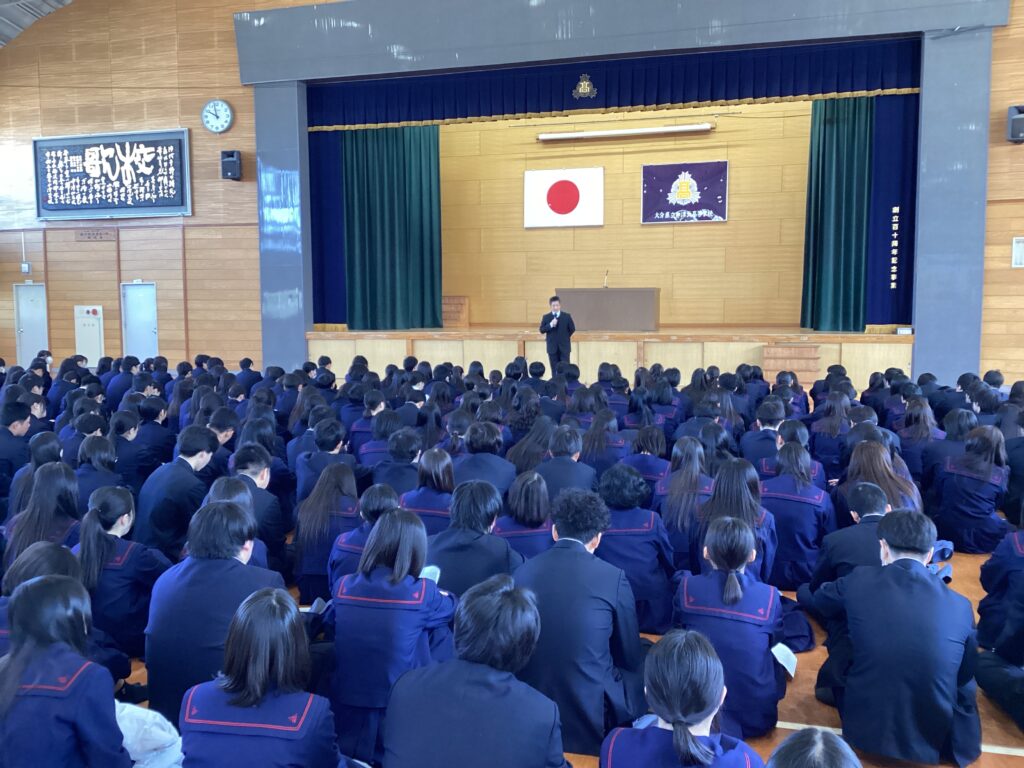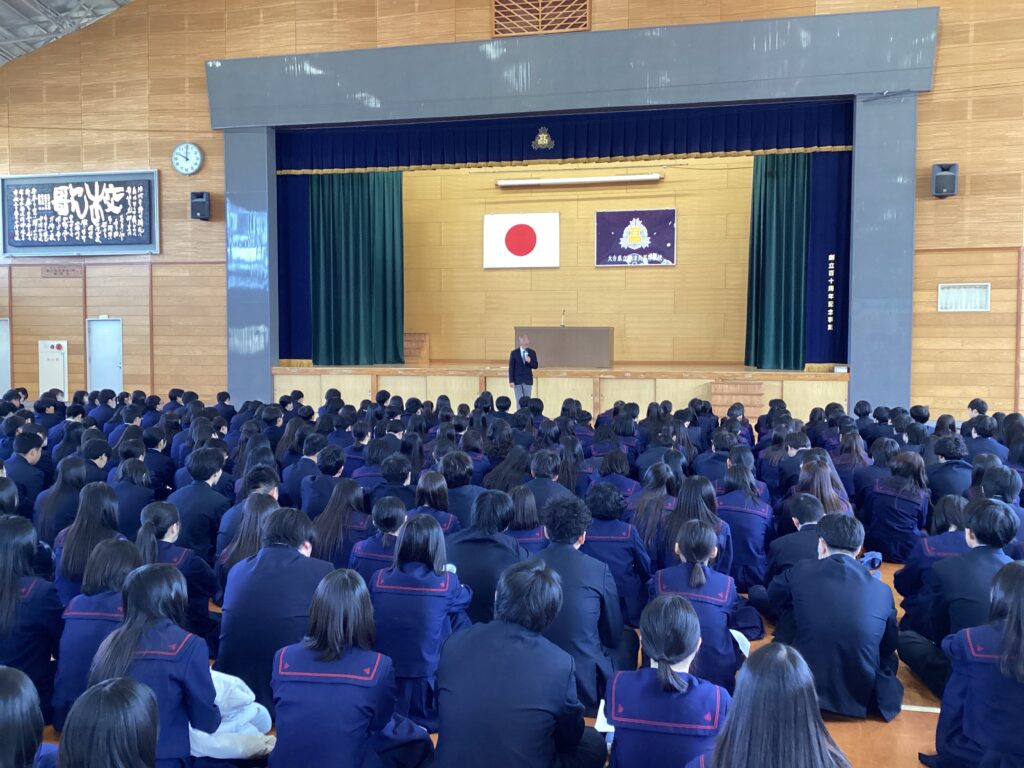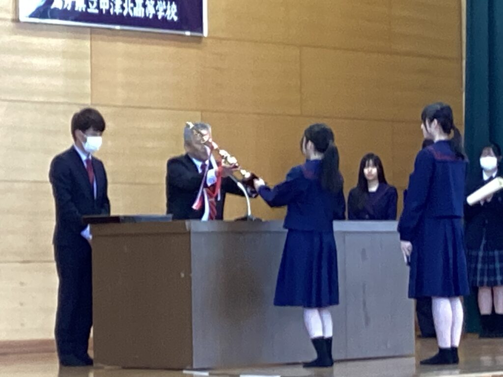 令和7年度修了式ならびに表彰式を実施しました。はじめに、書道部の全国大会出場における表彰、続いて吹奏楽部の全国大会金賞受賞の表彰を行い、日頃の努力の成果を全校で称えました。