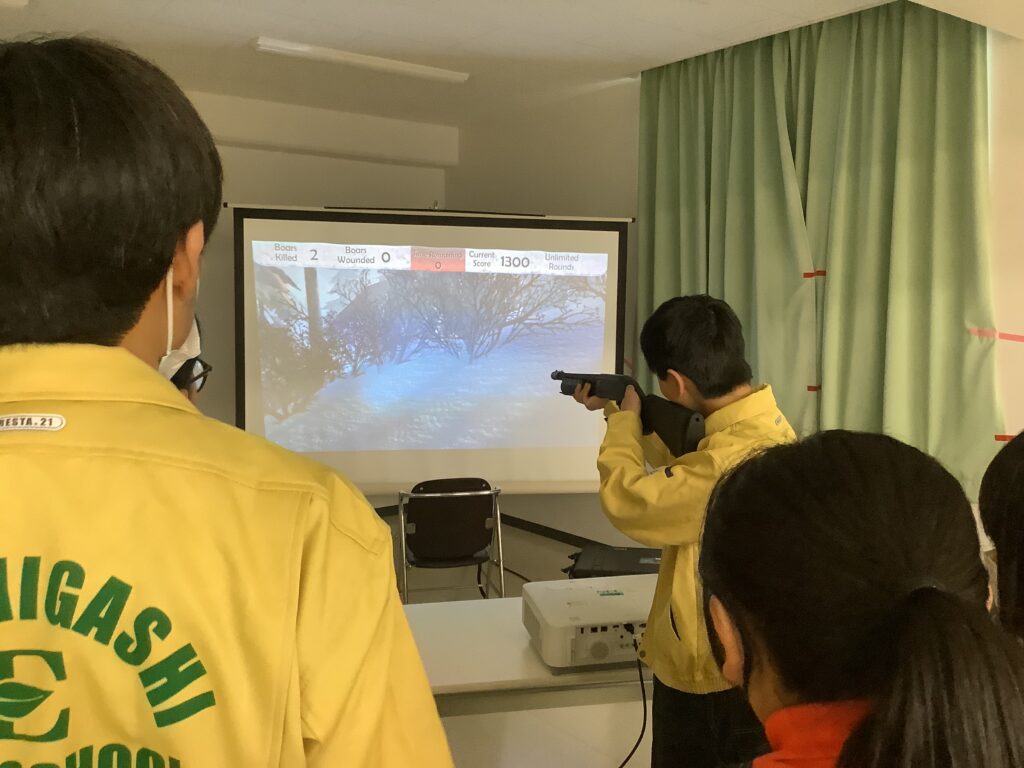 シューティングゲーム形式の教材で、楽しみながら銃の使い方を学ぶ場面もありました。