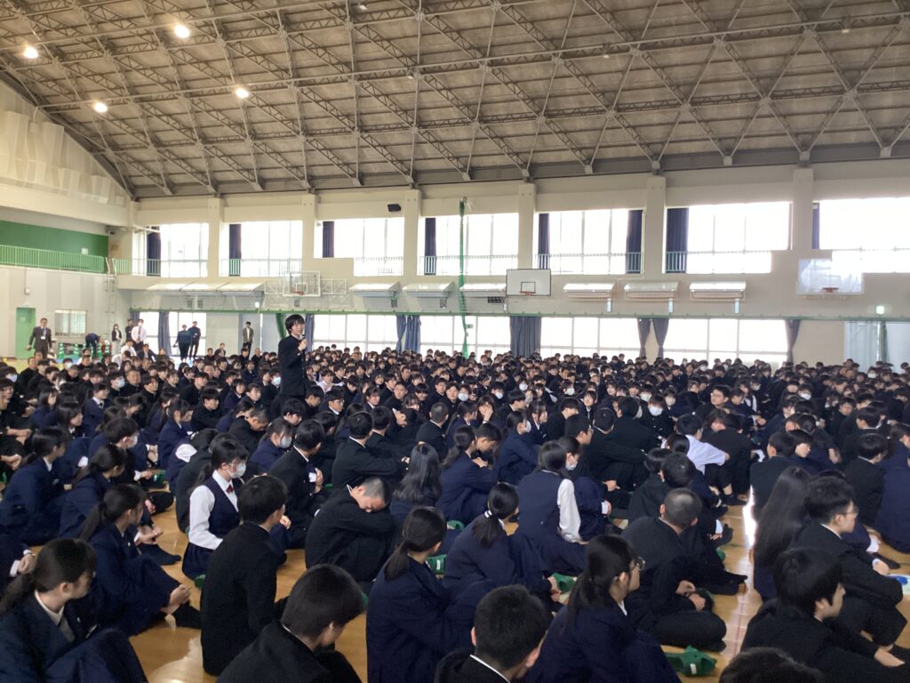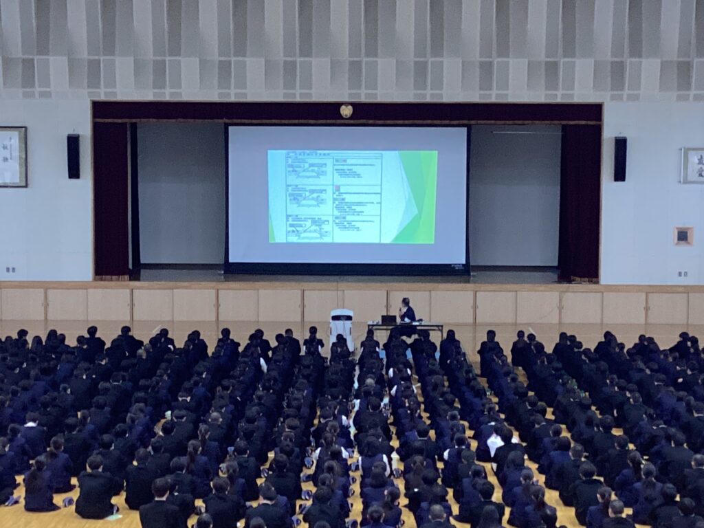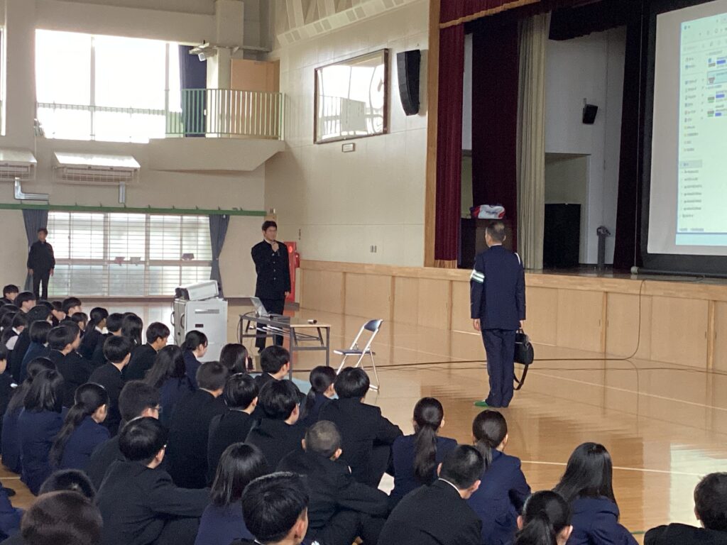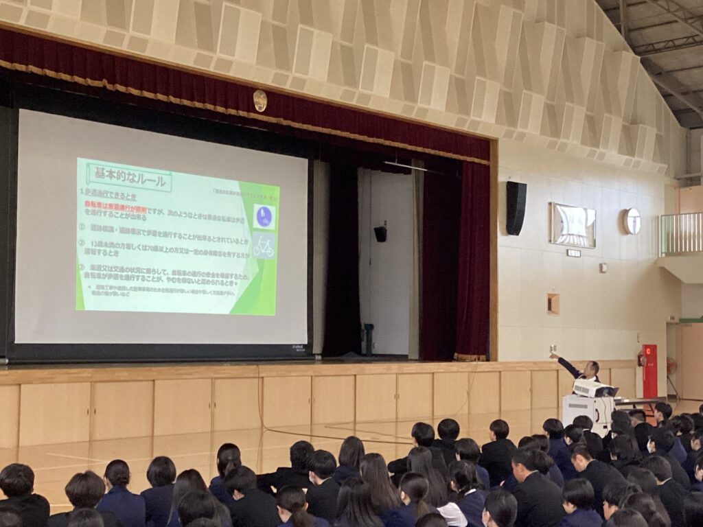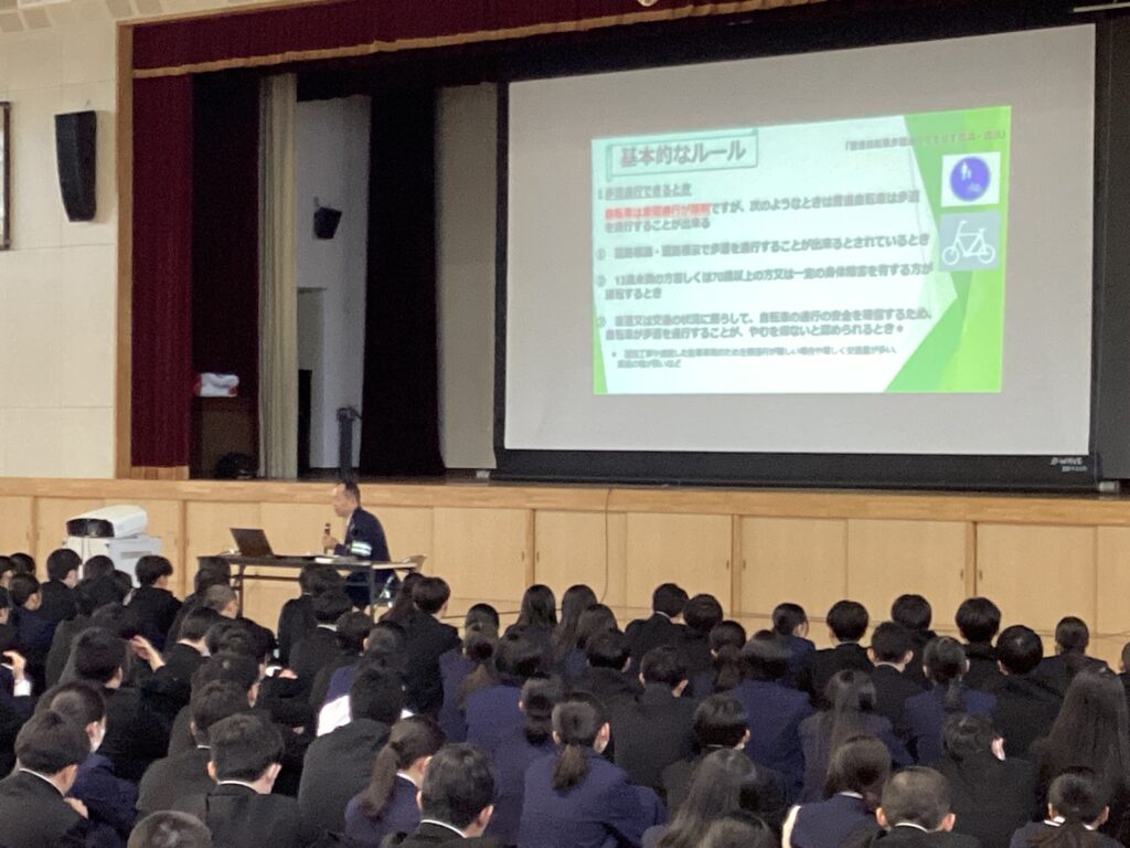令和8年4月1日から、道路交通法の一部を改正する法律が施行され、自転車の交通違反に交通反則通告制度(いわゆる「青切符」)が導入されました。今年は、大分中央警察署の後藤様に来校して頂き、自転車ルールや実際の事故の映像等を交えながら分かりやすく話をして頂きました。