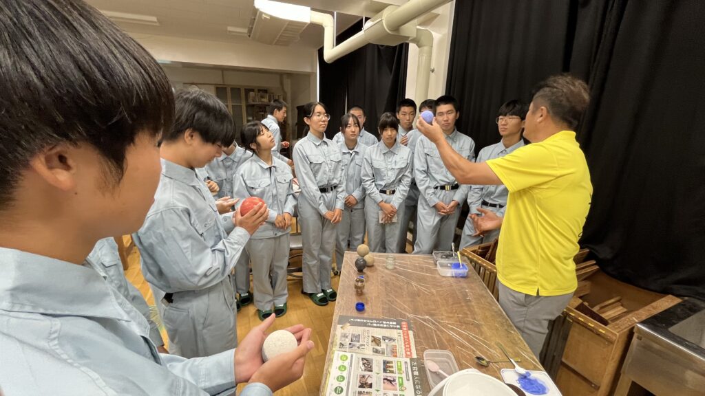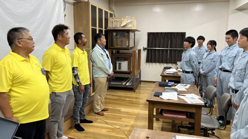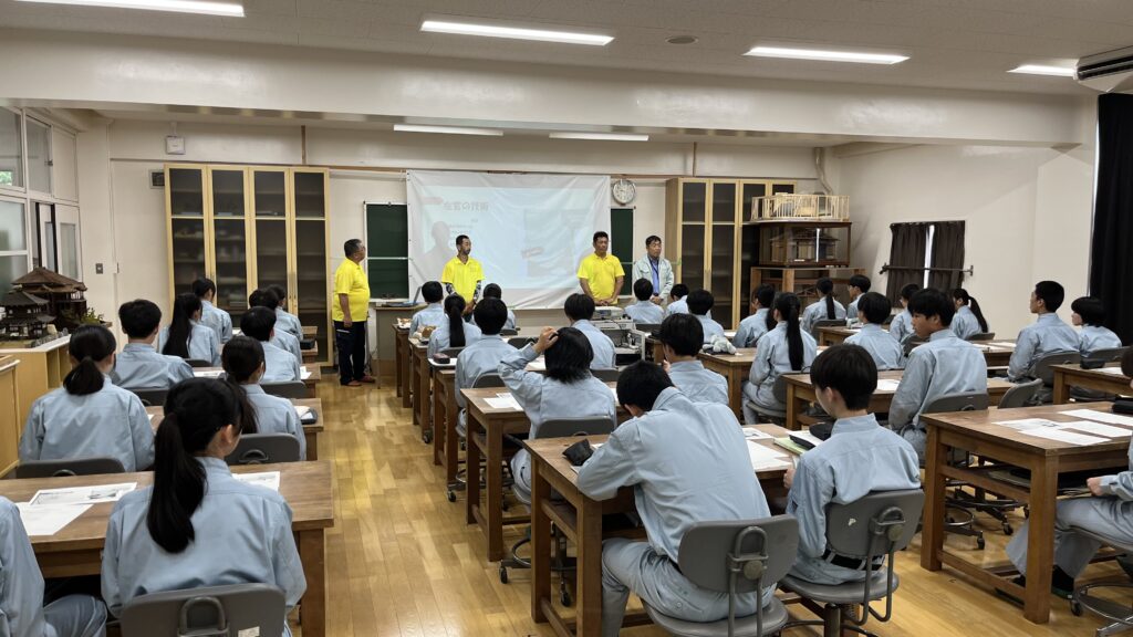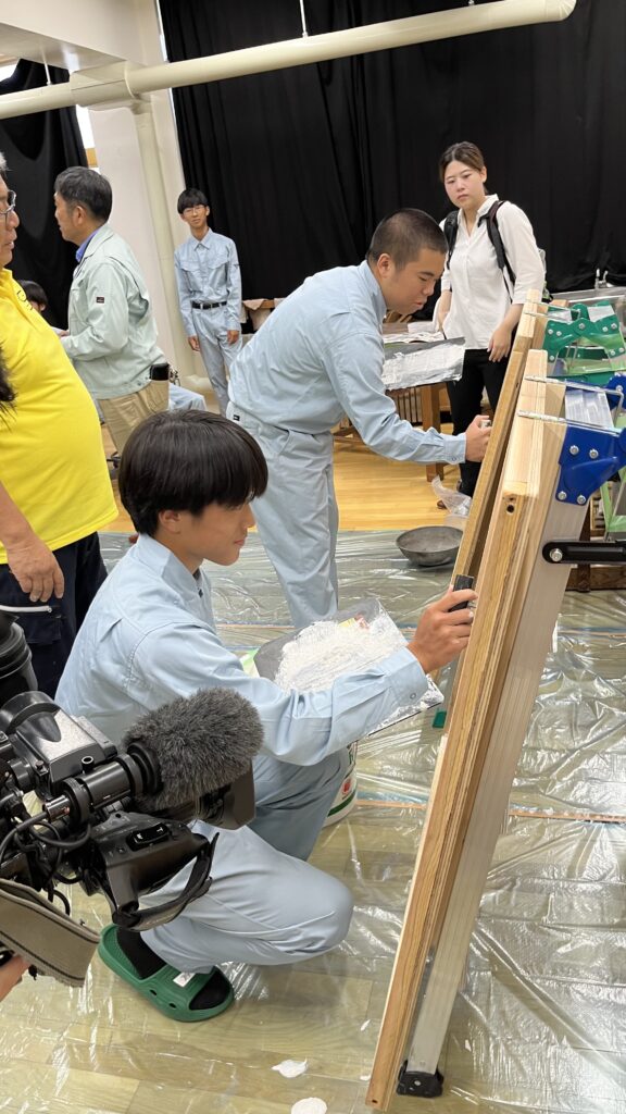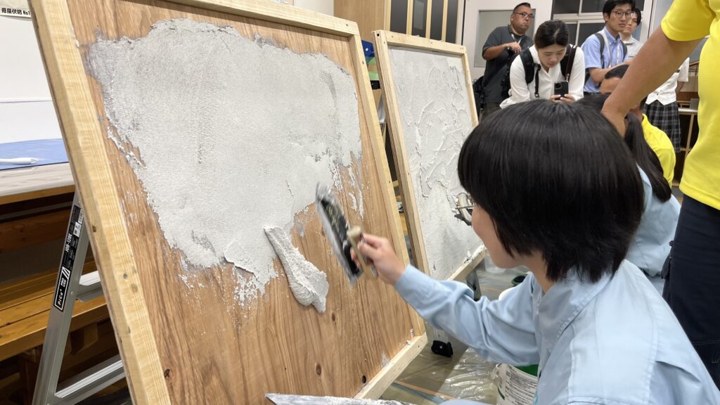 7月14日(月)2.3限に建築科1年生を対象とした「ものづくりマイスター出前授業」が開催されました。今回は左官の分野から、熟練の技を持つマイスターの方々にお越しいただき、左官の歴史、そしてその楽しさや奥深い魅力を体験を通して教えていただきました。生徒たちは、初めて触れる左官の技術に最初は少し戸惑いを見せていましたが、すぐにその面白さに引き込まれ、終始笑顔で熱心に取り組んでいました。漆喰を塗る感触や、鏝(こて)を使って仕上げていく作業を通して、左官職人の技術の高さとものづくりの楽しさを存分に感じられたようです。この貴重な体験は、生徒たちにとって非常に有意義な時間となりました。ものづくりの喜びとともに、左官という伝統的な技術への理解を深める素晴らしい機会を提供してくださったものづくりマイスターの皆様、本当にありがとうございました。