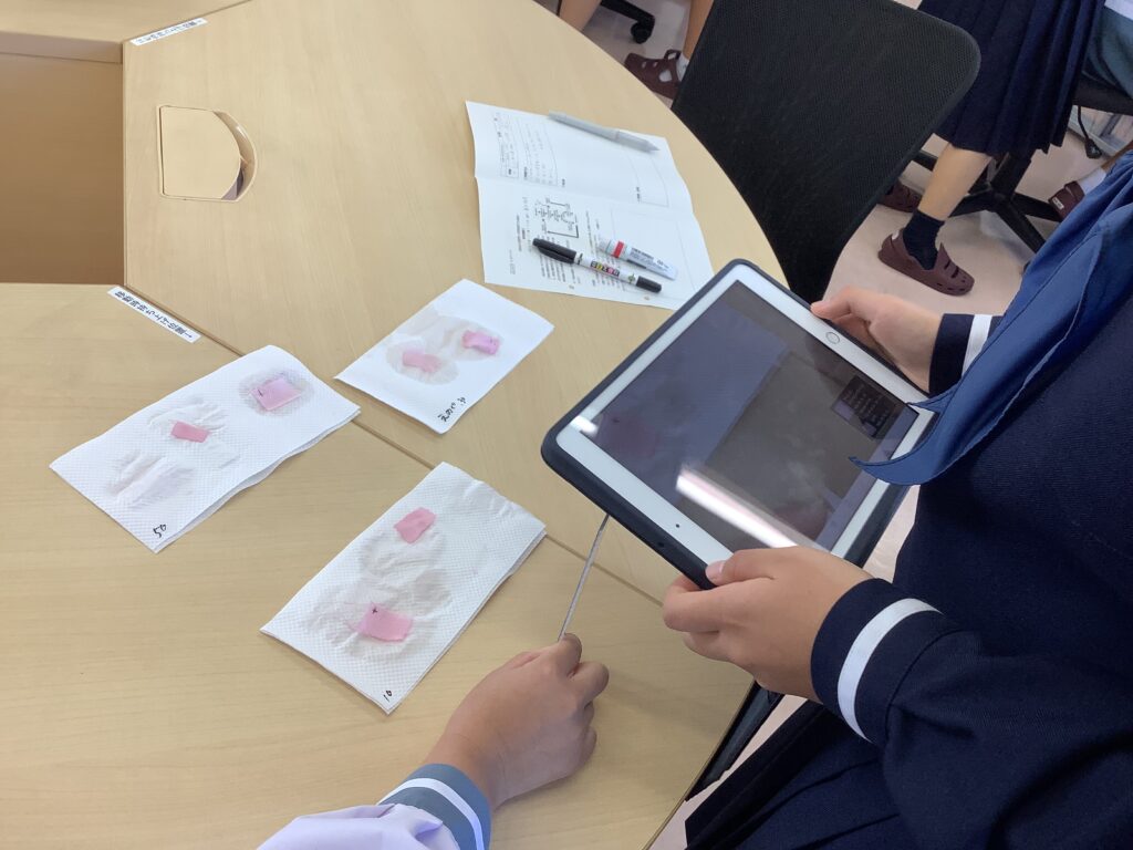 1回目の実験では「食酢」「染色液」「カリウムミョウバン」の三種類の液体を自分たちで混ぜ、「絹」「木綿」の二種類の布を染色しました。この時、班によって染色された布に色の違いがありました。布の種類以外にも染色液の濃度、混ぜる時間、等様々な「差」で出来上がりの色が変わります。色の違いはiPadのアプリを使うことによって「色を数値化」し、分析しました。