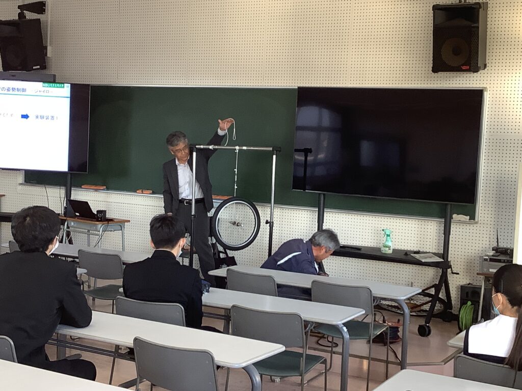 11月10日(月)、日本文理大学工学部航空宇宙工学科の丹生(にう)謙一教授が「宇宙工学をかじってみよう」と題して宇宙工学に係る講演をしてくださいました。参加生徒は38人でした。丹生先生は大分舞鶴高校を卒業後、東京大学と同大学院で工学系研究科航空学を学ばれました。卒業後は、三菱重工業で、日本のロケット(H-ⅡシリーズやH3ロケット)の開発等、多くの宇宙プロジェクトに参画されました。丹生先生はロケットや衛星の技術、最新の宇宙開発の話、そしてエンジニアとしての体験談等について、実験を交えながらわかり易くお話してくださり、参加生徒は質問を活発にしました。