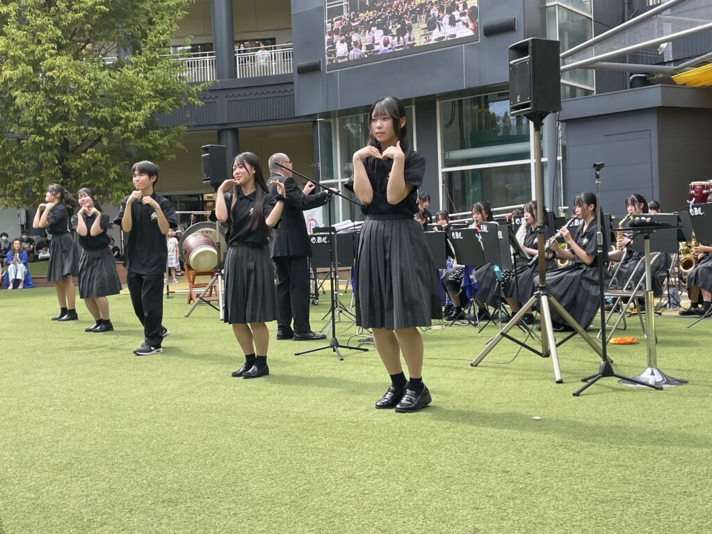 ミセスグリーンアップルを初めとした人気曲や現在流行りの曲など10曲を披露しました。サックスのソロパートや、部員によるダンスパーフォマンスなどで、会場は多くの聴衆者がおとづれ大いに盛り上がりました。客席からのアンコールに応え、「新宝島」を演奏し盛況のうちに終了しました。吹奏楽部のみなさん有難うございました。