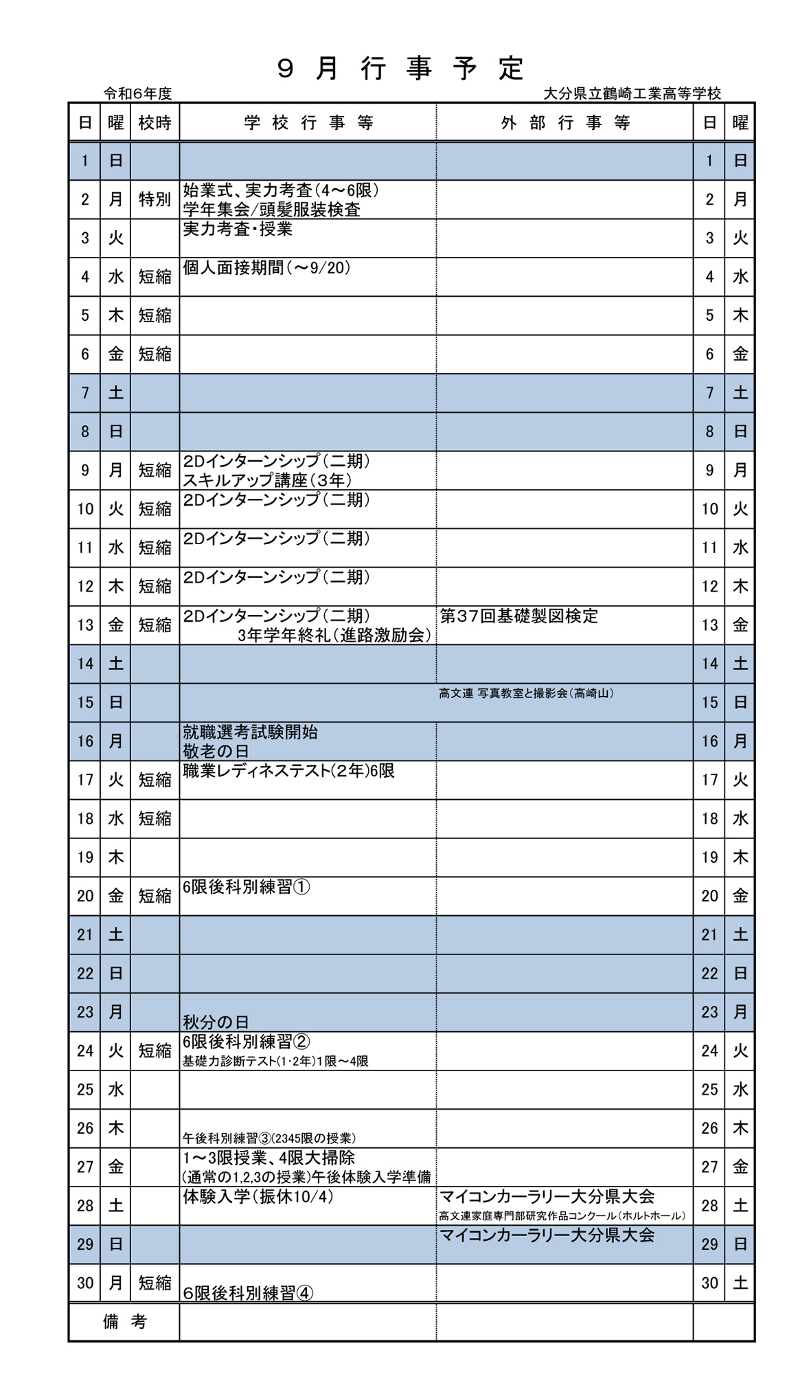9月 行事予定表 3.0