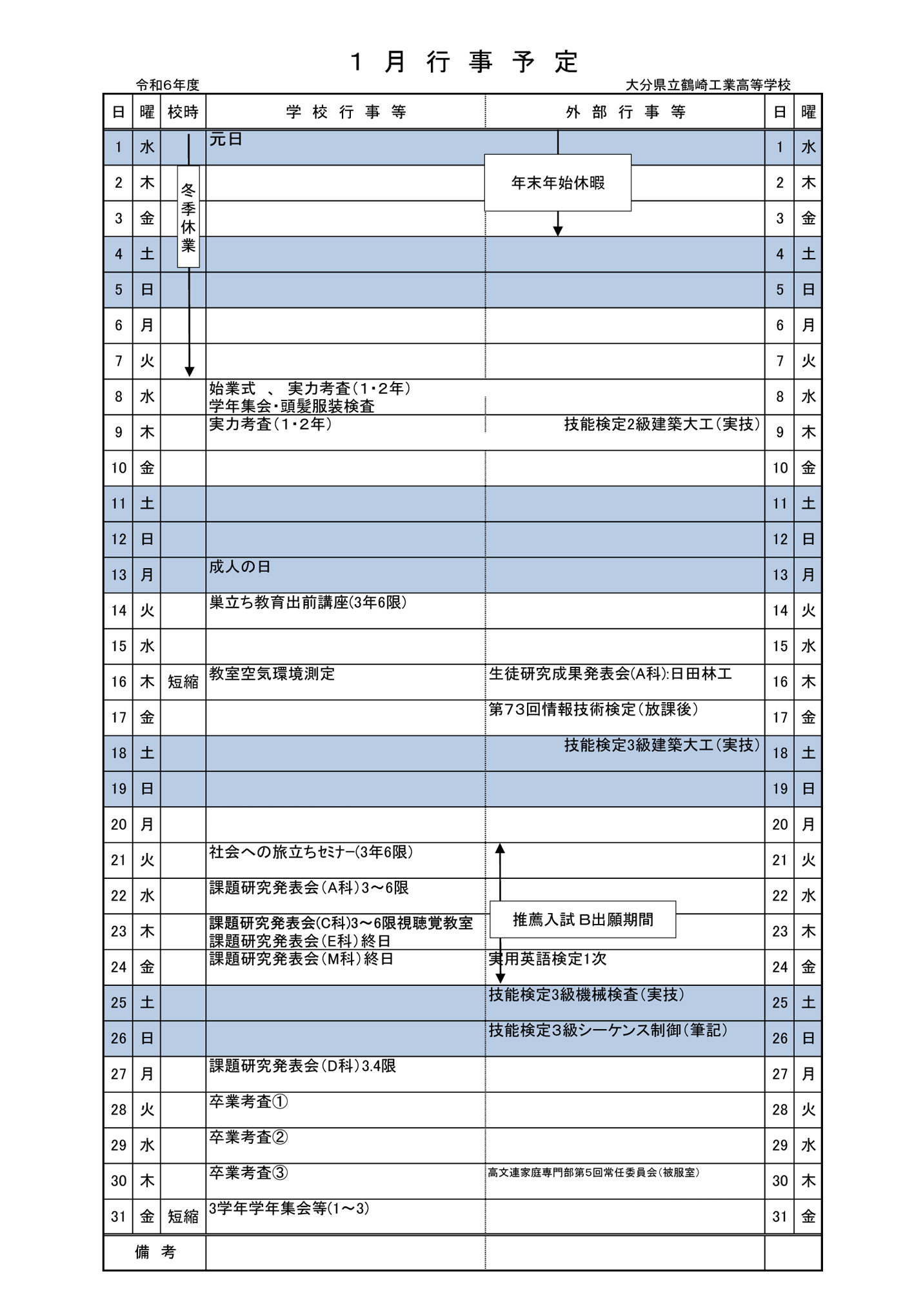 令和6年度 1月 行事予定表 2.0
