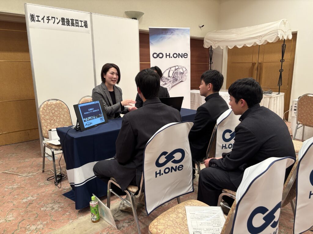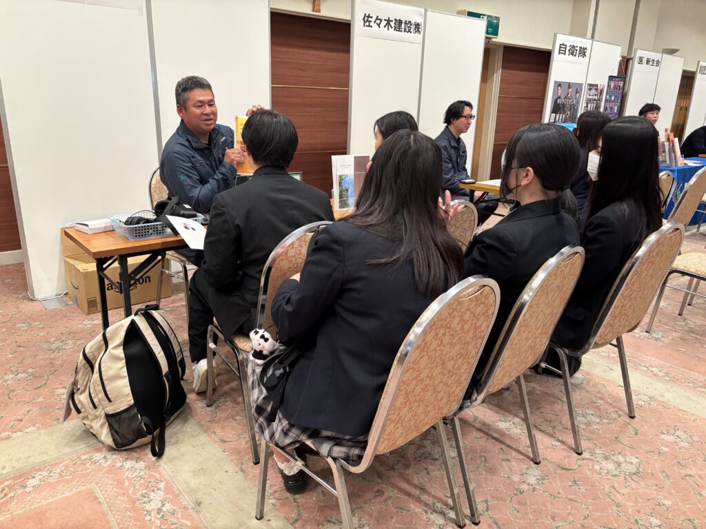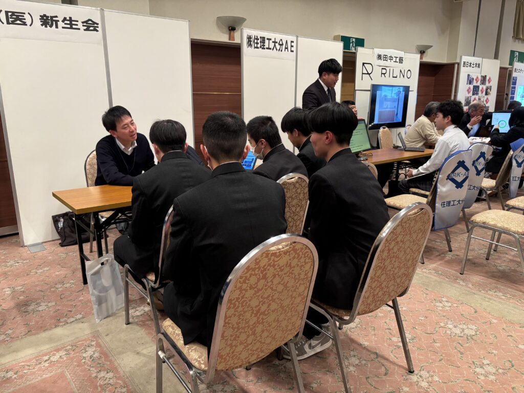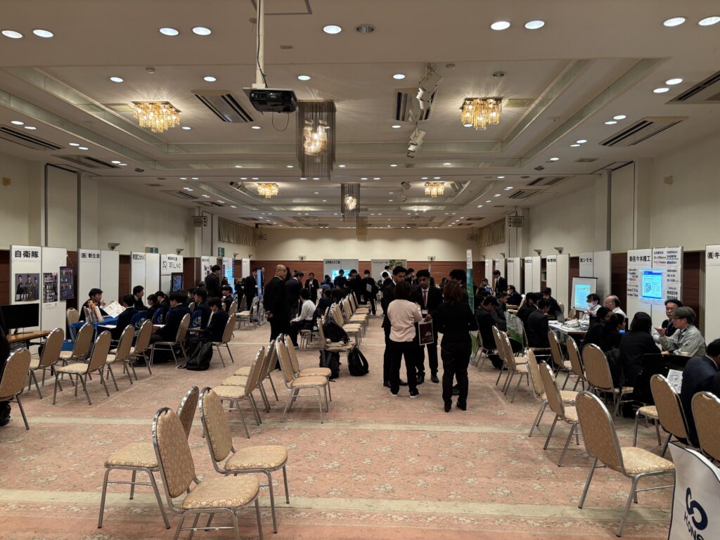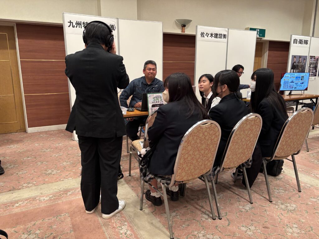 令和8年2月7日(土)に、本校2年生の就職希望者約70名が、豊後高田市の「ホテル清照」を会場とする『豊後高田市企業合同就職説明会』に参加しました。市が手配してくださった2台の大型バスに乗って学校と会場を往復した生徒と、豊後高田市在住の現地集合の生徒とがいました。当初は例年と同じく豊後高田市役所が会場の予定でしたが、衆議院解散による選挙が2月8日(日)に行われることになったため、豊後高田市役所にも近い「ホテル清照」に変更されての実施でした。昨年同時期の説明会では、前日からの降雪・積雪により、本校は生徒の安全を最優先し、やむなく参加を取りやめたこともあり、2年ぶりの参加となりました。今年も寒波襲来により、昨年の「断腸の思い」での不参加が頭をよぎりましたが、恙なく予定通り開催され、関係者一同安堵したところです。会場の「ホテル清照」1階の『六郷の間』には、豊後高田市に本社や工場を持つ20数社の企業等がブースを設置し、事業内容や職場の雰囲気、仕事のやりがいや働く現場に求められる人物像などについて、担当者様が丁寧にご説明くださいました。