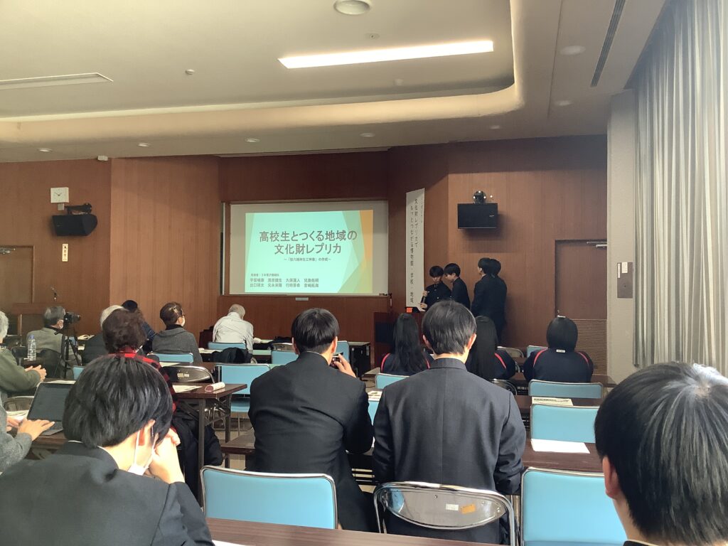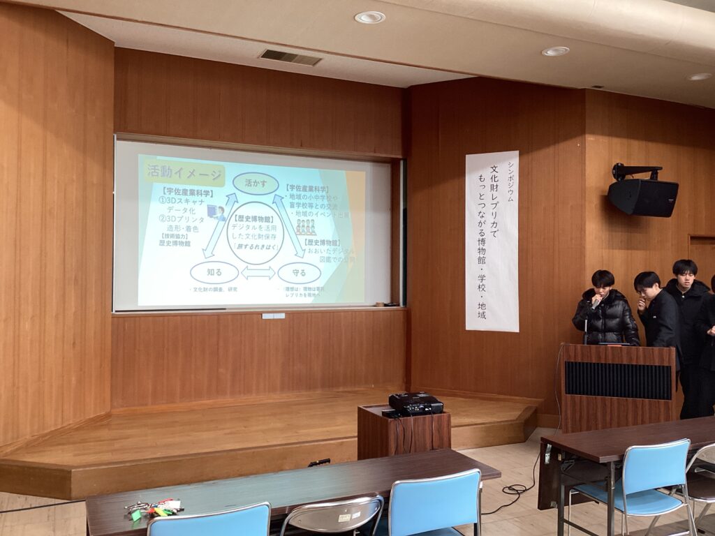 1月31日(土)大分県立歴史博物館にて行われたシンポジウムにて、電子機械科3年生の8名が事例報告として「櫻八幡神社(国東市)の神像彫刻の複製」の発表を行いました。
