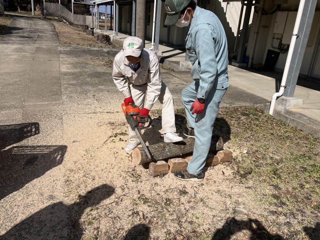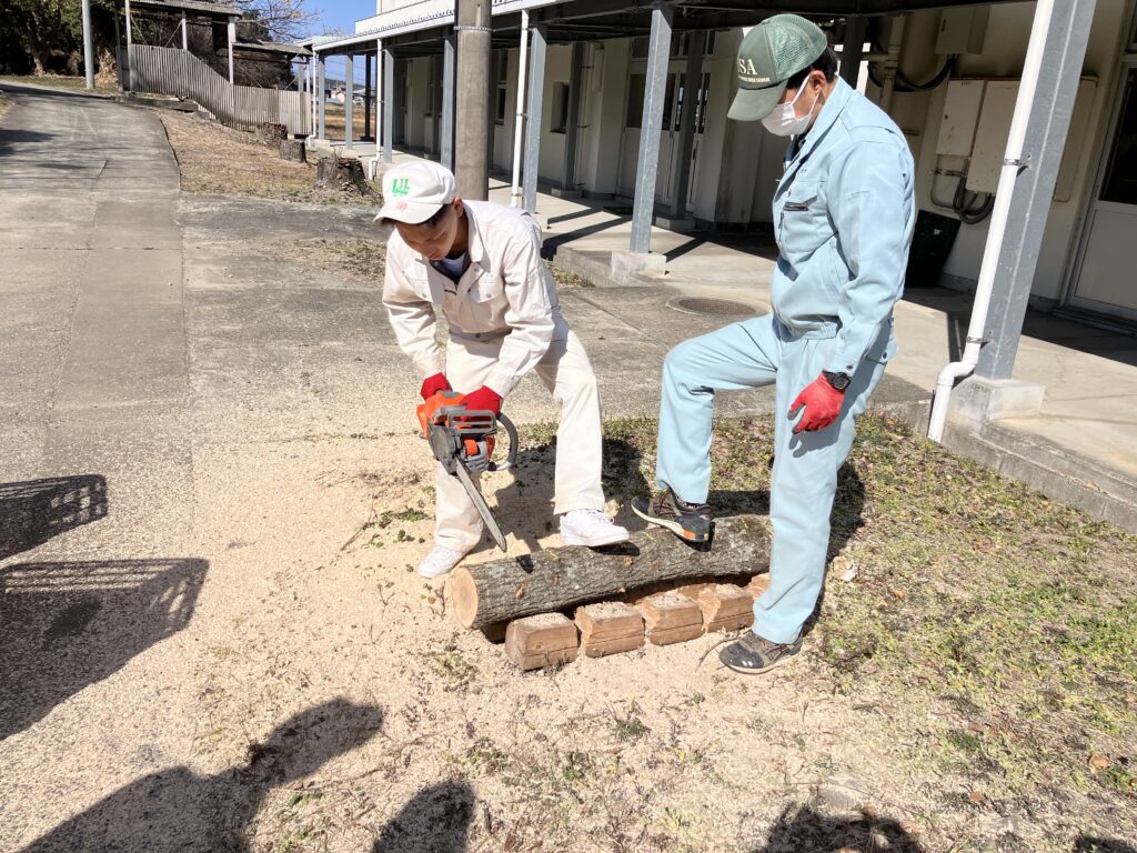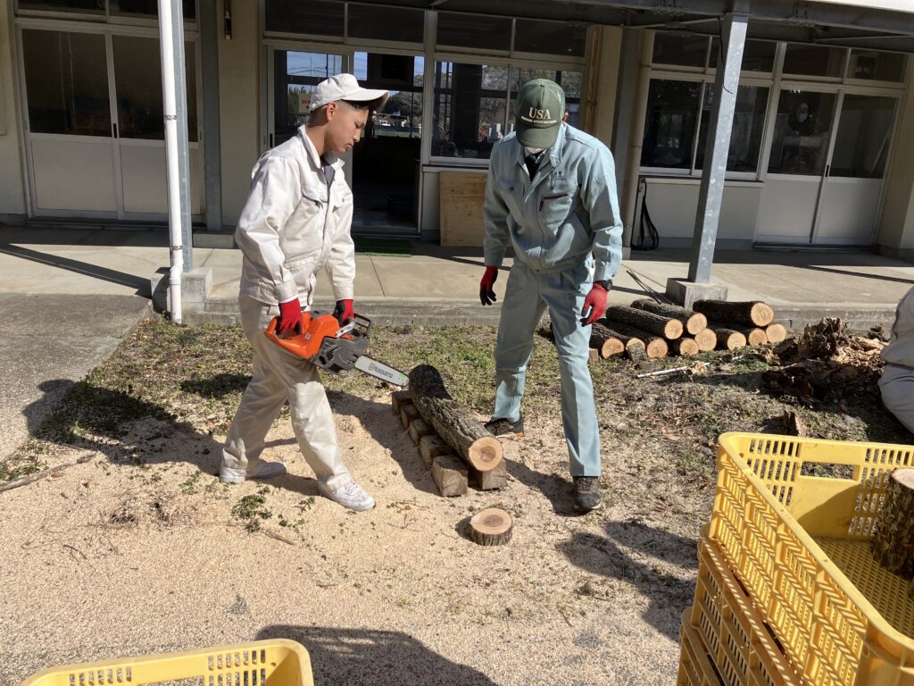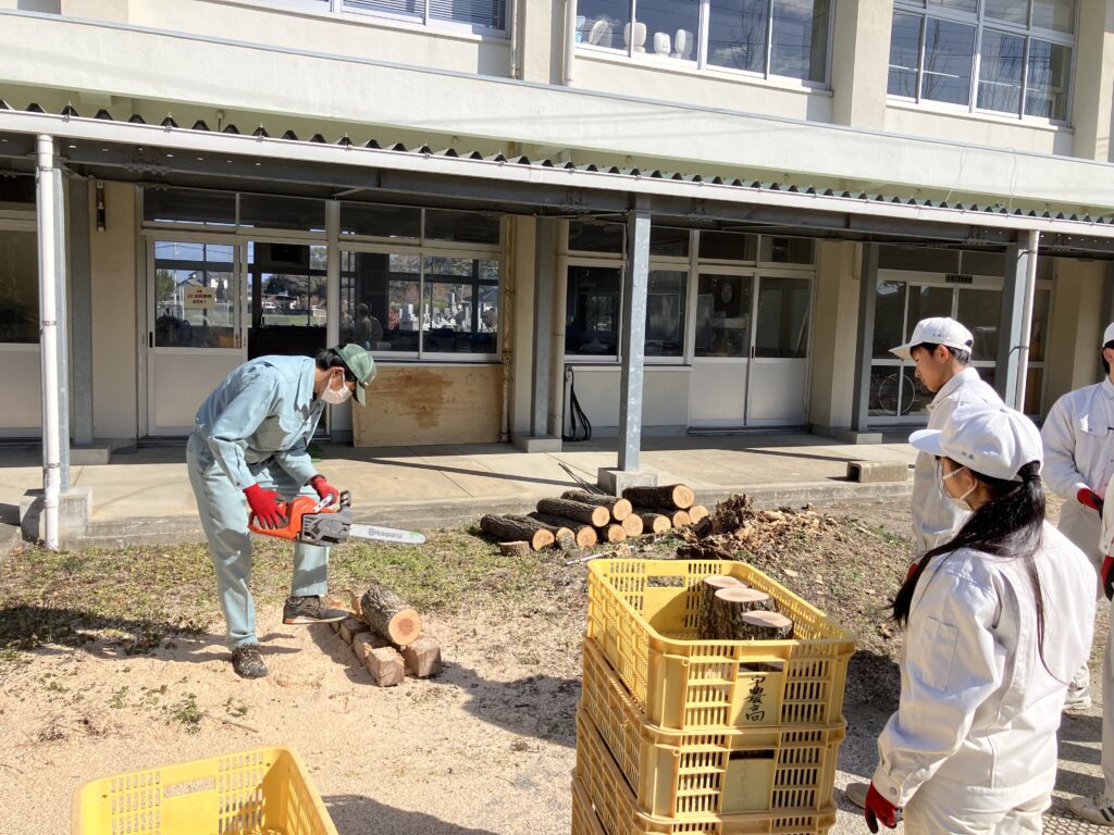 2月10日(火)、グリーン環境科2年生が、来年度のレイシの研究・栽培に向けて、原木(クヌギ)をチェーンソーで切断し、水に浸す準備作業を行いました。